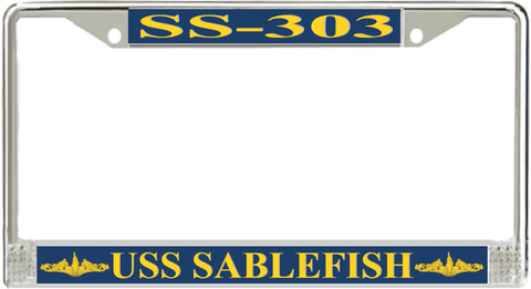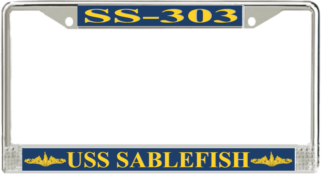 USS Sablefish SS-303 License Plate Frame This USS Sablefish SS-303 License Plate Frame is proudly made in the USA at our facilities in Scottsboro, Alabama. Each Frame features top and bottom sublimated design strips that are poly coated for a protective gloss finish. Please check your state and local regulations for compatibility of these frames for use on your vehicle.