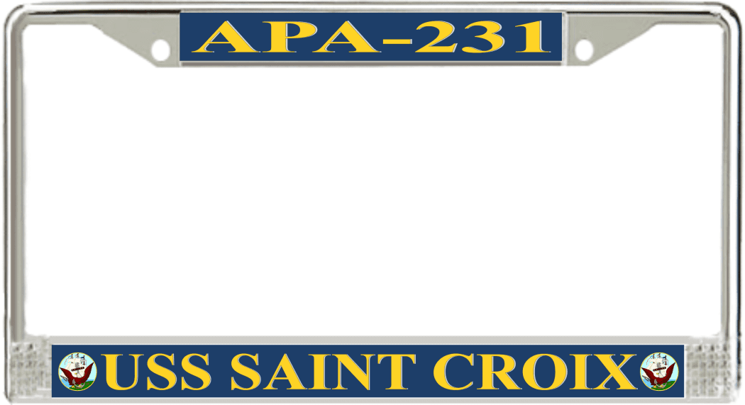 USS Saint Croix APA-231 License Plate FrameThis USS Saint Croix APA-231 License Plate Frame is proudly made in the USA at our facilities in Scottsboro, Alabama. Each of our MilitaryBest U.S. Navy Frames feature top and bottom Poly Coated Aluminum strips that are printed using sublimation which gives these quality automobile military frames a beautiful high gloss finish.