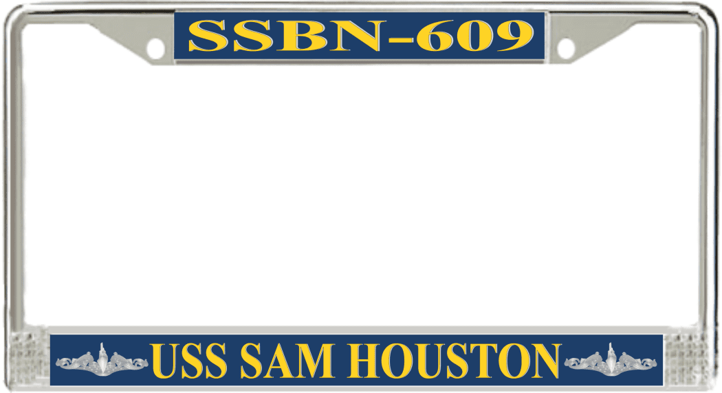 USS Sam Houston SSBN-609 License Plate Frame This USS Sam Houston SSBN-609 License Plate Frame is proudly made in the USA at our facilities in Scottsboro, Alabama. Each Frame features top and bottom sublimated design strips that are poly coated for a protective gloss finish. Please check your state and local regulations for compatibility of these frames for use on your vehicle.