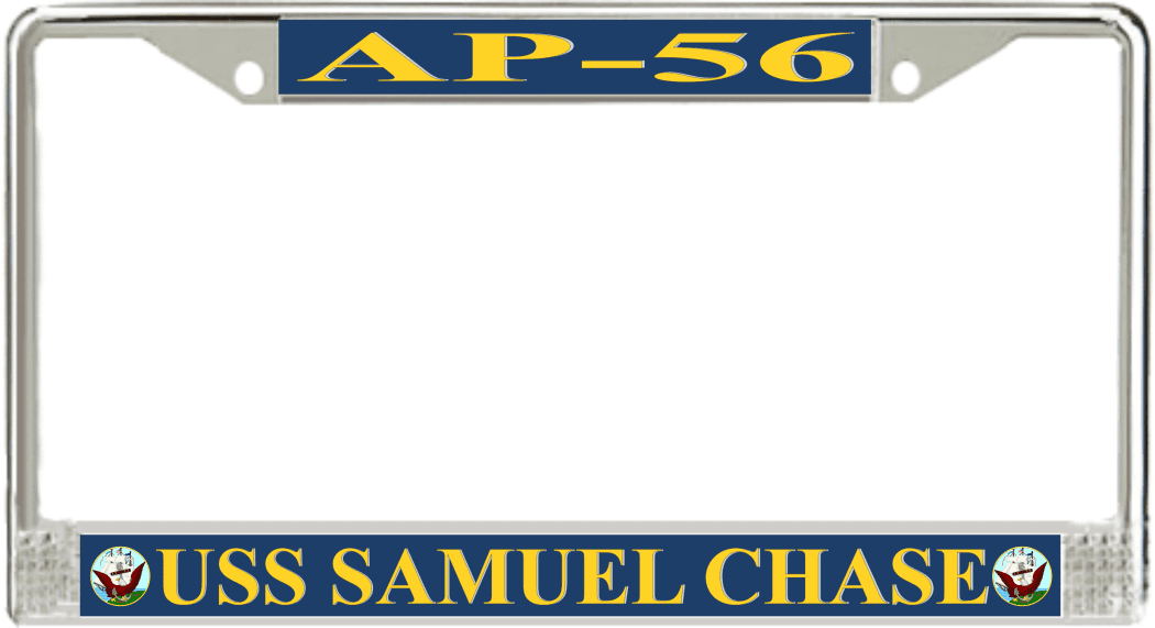 USS Samuel Chase AP-56 License Plate FrameThis USS Samuel Chase AP-56 License Plate Frame is proudly made in the USA at our facilities in Scottsboro, Alabama. Each of our MilitaryBest U.S. Navy Frames feature top and bottom Poly Coated Aluminum strips that are printed using sublimation which gives these quality automobile military frames a beautiful high gloss finish.