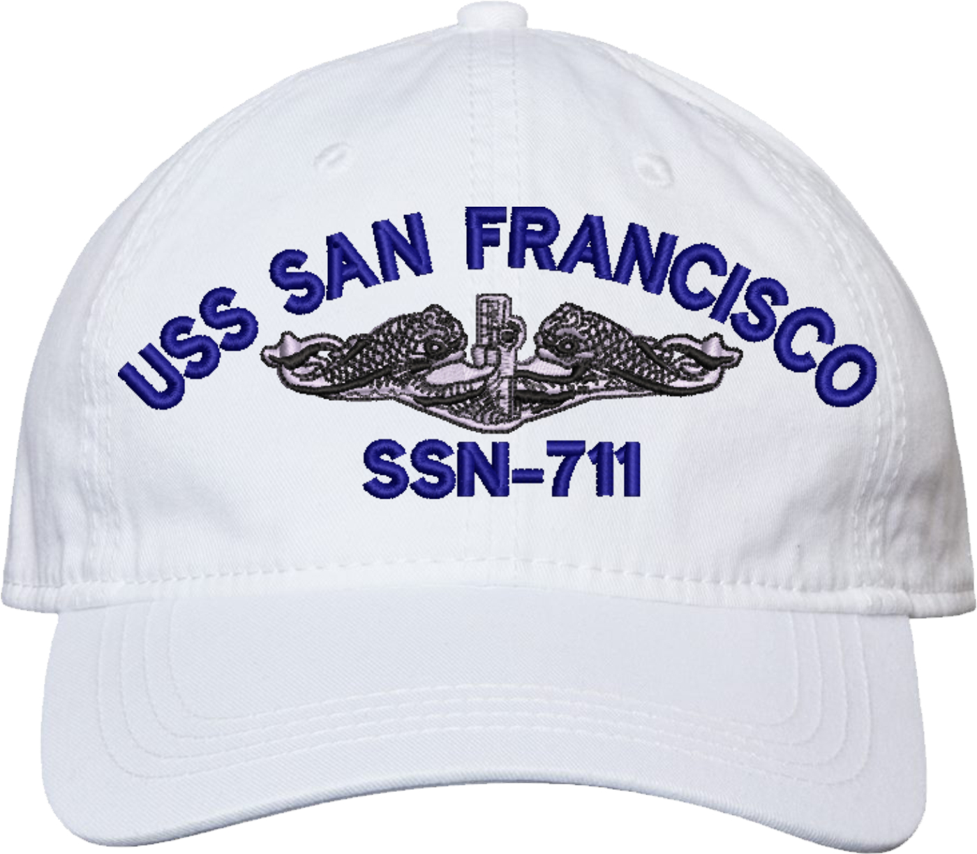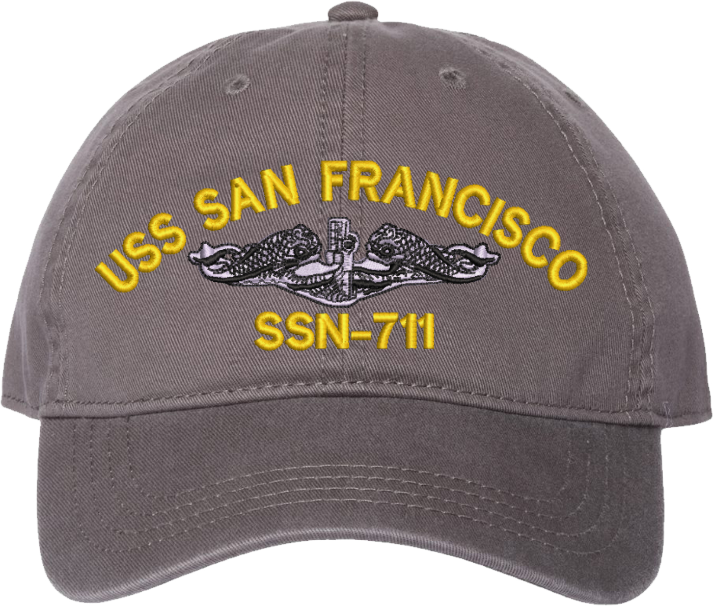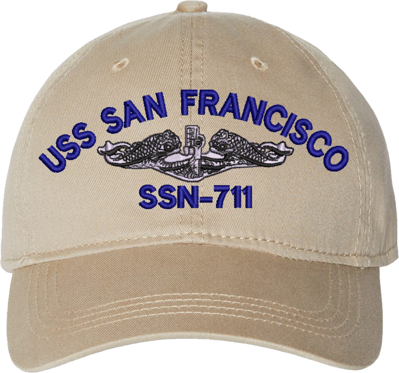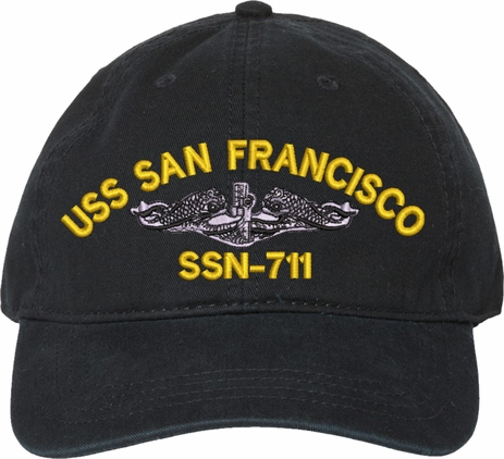 Show your Navy pride with this USS San Francisco SSN-711 with Dolphins Unstructured Dad Cap from MilitaryBest. Crafted from 100% washed chino twill cotton, this six-panel, low-profile cap offers a relaxed and comfortable fit. Featuring high-quality embroidery done in our Scottsboro, Alabama facility, this cap is designed with a pre-curved visor and an adjustable tri-glide buckle closure for a perfect fit. Whether for everyday wear or as a meaningful gift, this cap is a great way to honor your own or a loved one's service.For caps ordered with custom embroidered personalized text please allow an additional 3 to 5 days production time. All custom back text will be embroidered in ALL CAPITAL LETTERS. Caps with back text or eggs are non-returnable unless there is a material defect in the cap.