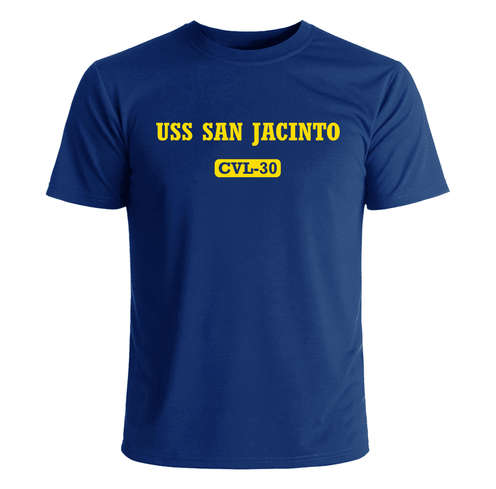 Please enjoy this US Navy officially licensed USS San Jacinto CVL-30 T-Shirt. It is a 100% cotton shirt and is available in S, M, L, XL, 2X, 3X and 4X sizes.A percentage of the sale of each MilitaryBest item is forwarded to the licensing departments of each respective branch of service in support of the MWR (Morale, Welfare, & Recreation) program. These payments are made by either ALL4U LLC or the wholesaler from where the item originated. Our team thanks you for your service and your support of these programs.