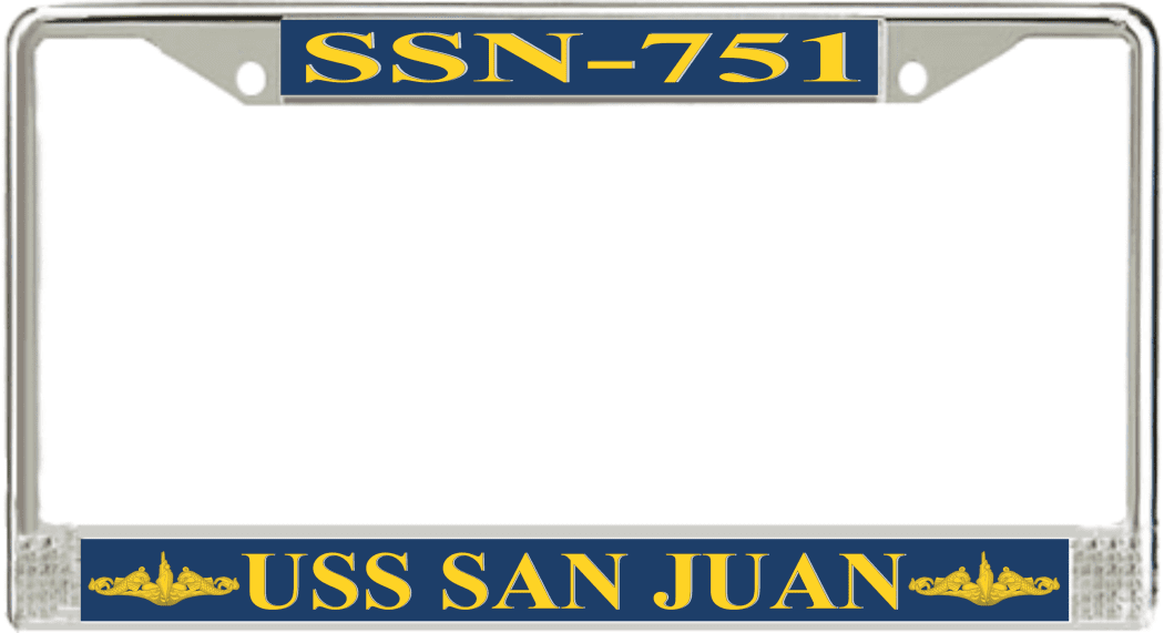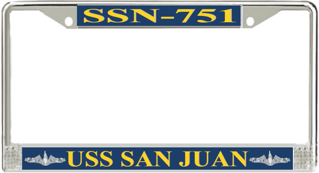 USS San Juan SSN-751 License Plate Frame This USS San Juan SSN-751 License Plate Frame is proudly made in the USA at our facilities in Scottsboro, Alabama. Each Frame features top and bottom sublimated design strips that are poly coated for a protective gloss finish. Please check your state and local regulations for compatibility of these frames for use on your vehicle.