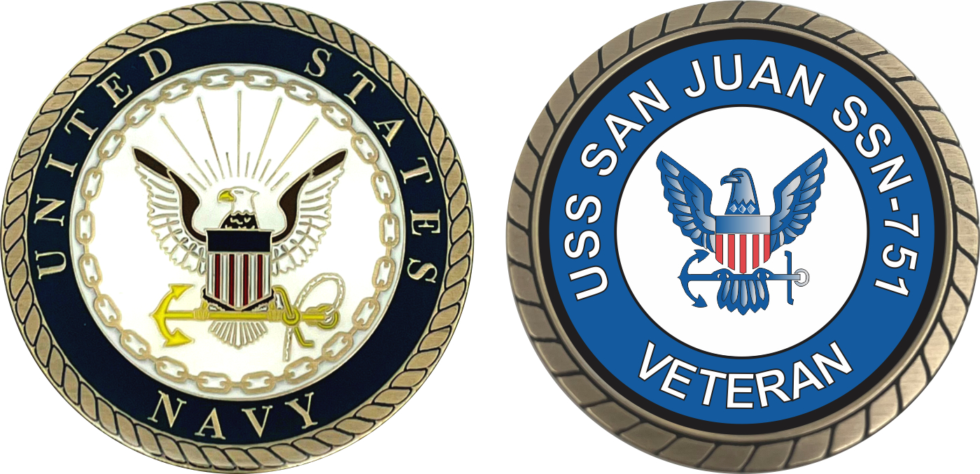 This 1 3/4 USS San Juan SSN-751 Veteran Challenge Coin is proudly offered by MilitaryBest. This Officially Licensed Navy coin has beautiful enamel finish on one side and an organized crisp clean USS San Juan SSN-751 Veteran design on the opposite side.