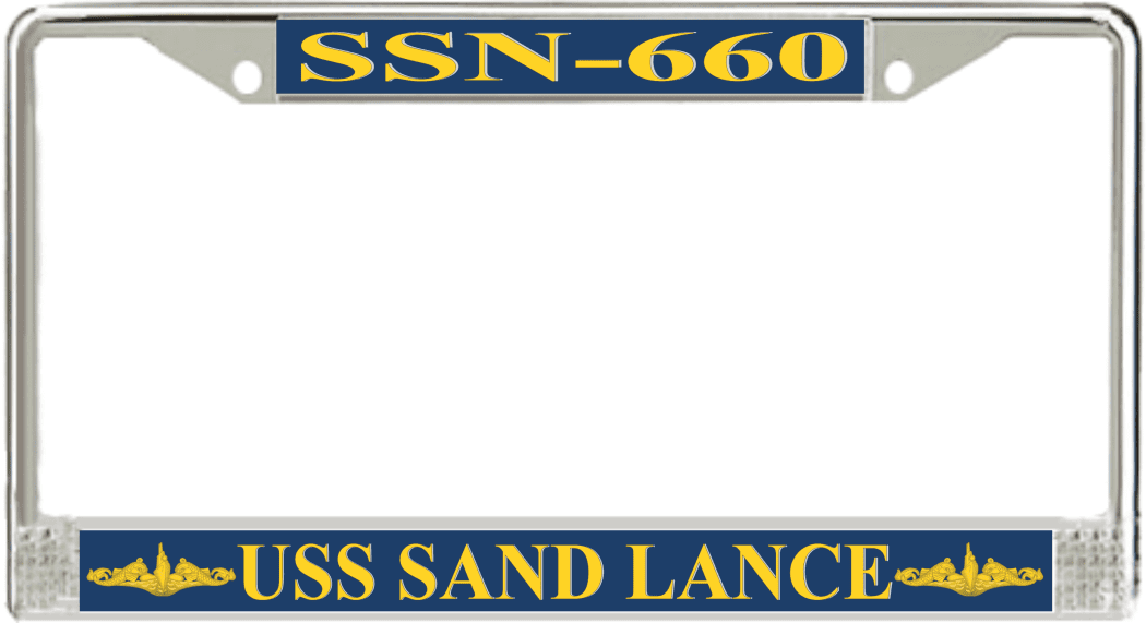USS Sand Lance SSN-660 License Plate Frame This USS Sand Lance SSN-660 License Plate Frame is proudly made in the USA at our facilities in Scottsboro, Alabama. Each Frame features top and bottom sublimated design strips that are poly coated for a protective gloss finish. Please check your state and local regulations for compatibility of these frames for use on your vehicle.