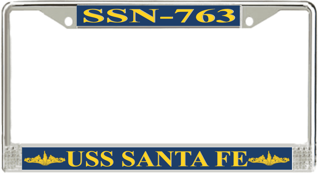 USS Santa Fe SSN-763 License Plate Frame This USS Santa Fe SSN-763 License Plate Frame is proudly made in the USA at our facilities in Scottsboro, Alabama. Each Frame features top and bottom sublimated design strips that are poly coated for a protective gloss finish. Please check your state and local regulations for compatibility of these frames for use on your vehicle.