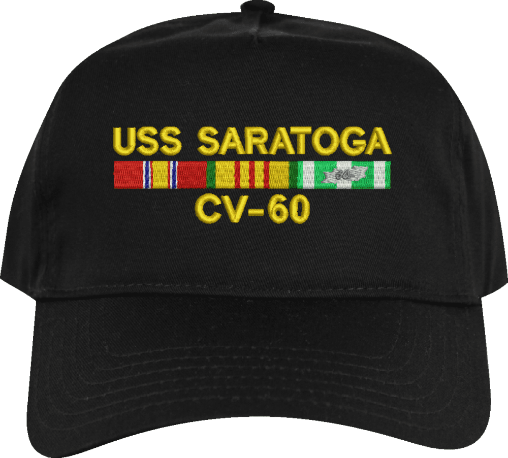 MilitaryBest is proud to offer this USS Saratoga CV-60 with Vietnam Service Ribbons Embroidered Cap. This cap is available in a 5 panel high profile or 6 panel low profile styling. All our caps are made from top quality materials. This cap would make a wonderful addition to your collection or a great gift! All custom embroidery is done at our facility in Scottsboro, AL. *Caps ordered with embroidered back text requires an additional 1 to 2 days of production time. All personalized caps will be embroidered in ALL CAPITAL LETTERS. Caps personalized with back text are not returnable unless there is a material defect in the cap.A percentage of the sale of each MilitaryBest item is forwarded to the licensing departments of each respective branch of service in support of the MWR (Morale, Welfare, & Recreation) program. These payments are made by either ALL4U LLC or the wholesaler from where the item originated. Our team thanks you for your service and your support of these programs.