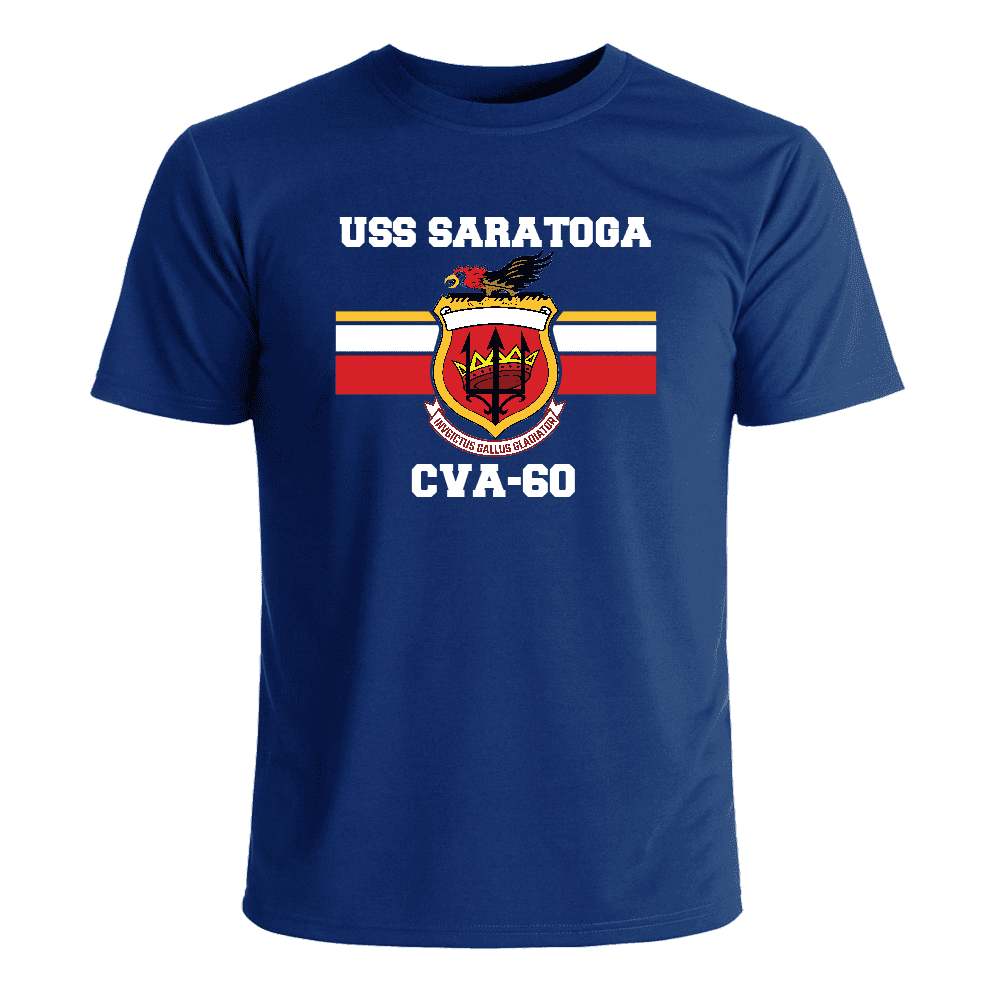 MilitaryBest is proud to offer this U.S. Navy Aircraft Carrier Crest T-Shirt. Each design is offered in Navy Blue. This fine USS Saratoga CVA-60 Crest T-Shirt is proudly printed in the USA. The quality of all of our Military products is guaranteed. Unless there is a defect in workmanship or material, these shirts are unreturnable. To all of our Vietnam Veterans WELCOME HOME!A percentage of the sale of each MilitaryBest item is forwarded to the licensing departments of each respective branch of service in support of the MWR (Morale, Welfare, & Recreation) program. These payments are made by either ALL4U LLC or the wholesaler from where the item originated. Our team thanks you for your service and your support of these programs.