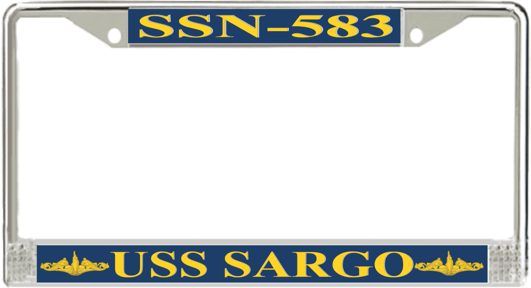USS Sargo SSN-583 License Plate Frame This USS Sargo SSN-583 License Plate Frame is proudly made in the USA at our facilities in Scottsboro, Alabama. Each Frame features top and bottom sublimated design strips that are poly coated for a protective gloss finish. Please check your state and local regulations for compatibility of these frames for use on your vehicle.