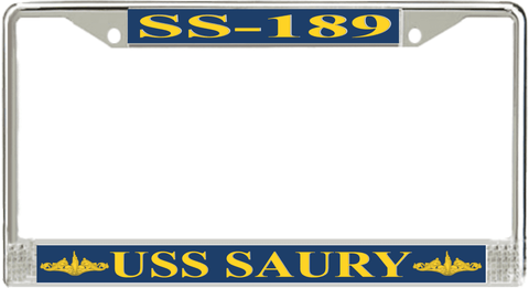 USS Saury SS-189 License Plate Frame This USS Saury SS-189 License Plate Frame is proudly made in the USA at our facilities in Scottsboro, Alabama. Each Frame features top and bottom sublimated design strips that are poly coated for a protective gloss finish. Please check your state and local regulations for compatibility of these frames for use on your vehicle.