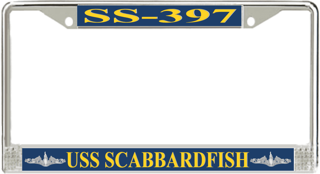 USS Scabbardfish SS-397 License Plate Frame This USS Scabbardfish SS-397 License Plate Frame is proudly made in the USA at our facilities in Scottsboro, Alabama. Each Frame features top and bottom sublimated design strips that are poly coated for a protective gloss finish. Please check your state and local regulations for compatibility of these frames for use on your vehicle.