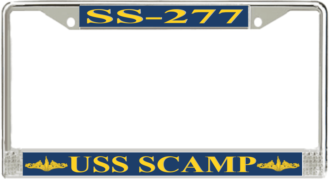 USS Scamp SS-277 License Plate Frame This USS Scamp SS-277 License Plate Frame is proudly made in the USA at our facilities in Scottsboro, Alabama. Each Frame features top and bottom sublimated design strips that are poly coated for a protective gloss finish. Please check your state and local regulations for compatibility of these frames for use on your vehicle.
