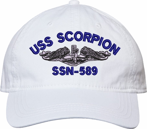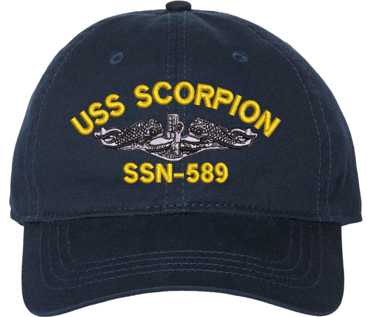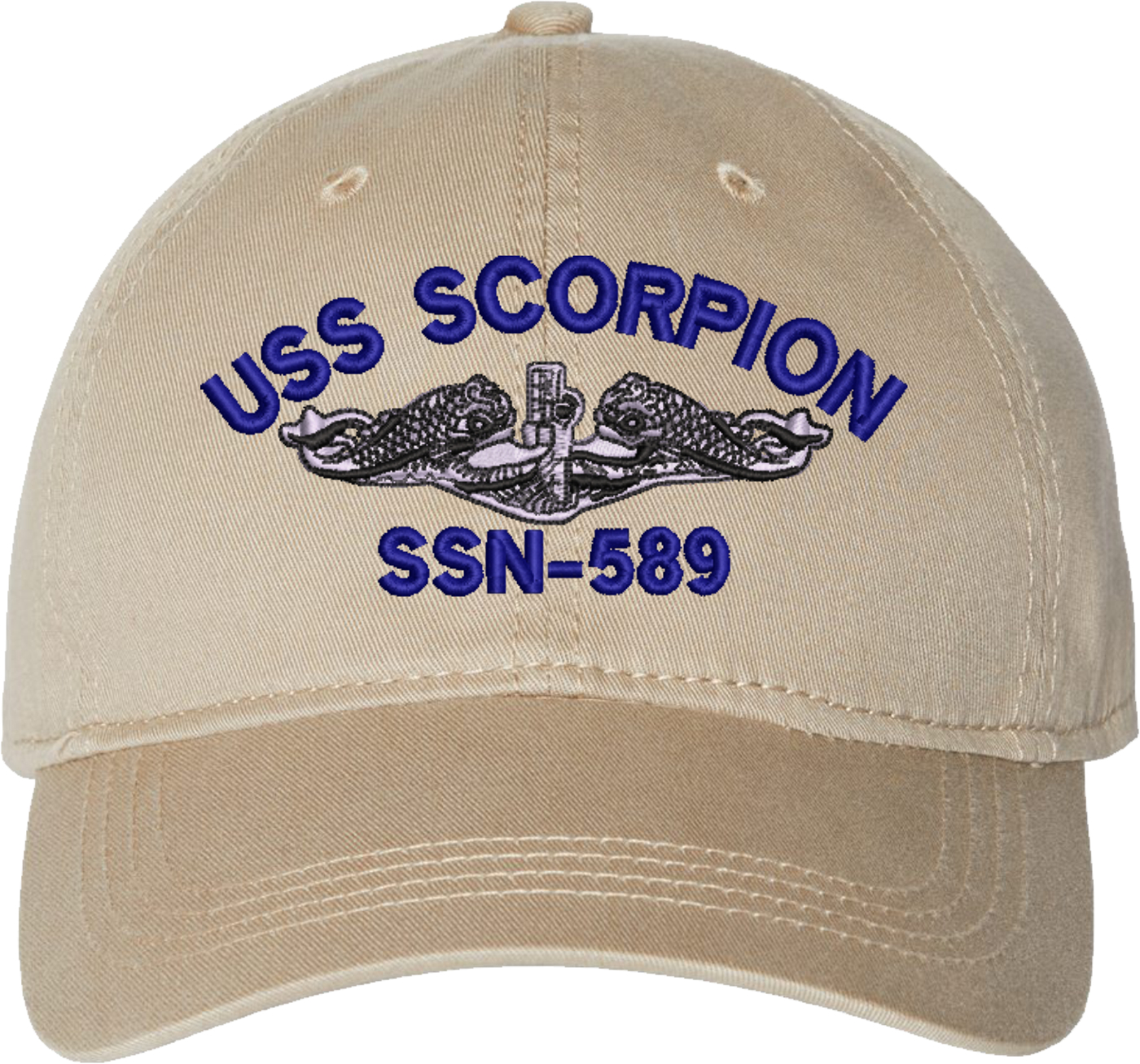 Show your Navy pride with this USS Scorpion SSN-589 with Dolphins Unstructured Dad Cap from MilitaryBest. Crafted from 100% washed chino twill cotton, this six-panel, low-profile cap offers a relaxed and comfortable fit. Featuring high-quality embroidery done in our Scottsboro, Alabama facility, this cap is designed with a pre-curved visor and an adjustable tri-glide buckle closure for a perfect fit. Whether for everyday wear or as a meaningful gift, this cap is a great way to honor your own or a loved one's service.For caps ordered with custom embroidered personalized text please allow an additional 3 to 5 days production time. All custom back text will be embroidered in ALL CAPITAL LETTERS. Caps with back text or eggs are non-returnable unless there is a material defect in the cap.