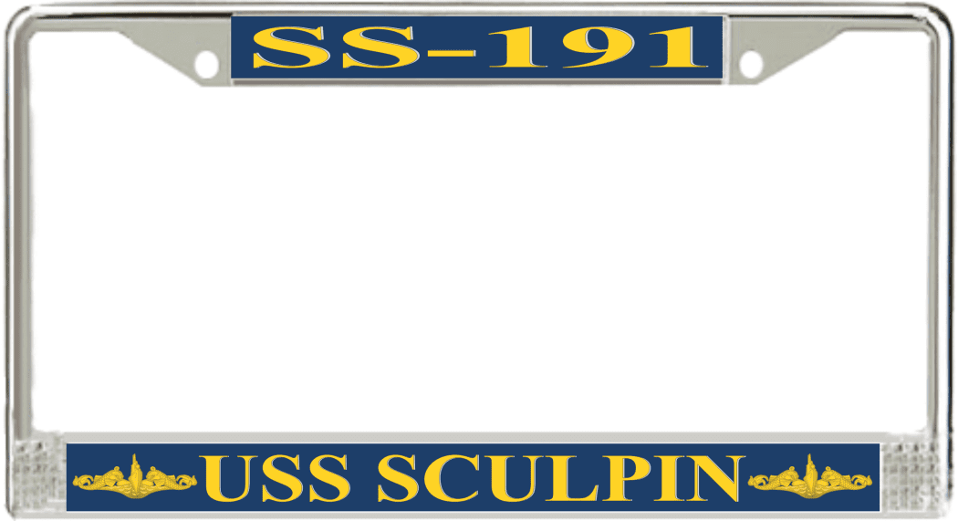 USS Sculpin SS-191 License Plate Frame This USS Sculpin SS-191 License Plate Frame is proudly made in the USA at our facilities in Scottsboro, Alabama. Each Frame features top and bottom sublimated design strips that are poly coated for a protective gloss finish. Please check your state and local regulations for compatibility of these frames for use on your vehicle.