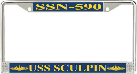 USS Sculpin SSN-590 License Plate Frame This USS Sculpin SSN-590 License Plate Frame is proudly made in the USA at our facilities in Scottsboro, Alabama. Each Frame features top and bottom sublimated design strips that are poly coated for a protective gloss finish. Please check your state and local regulations for compatibility of these frames for use on your vehicle.