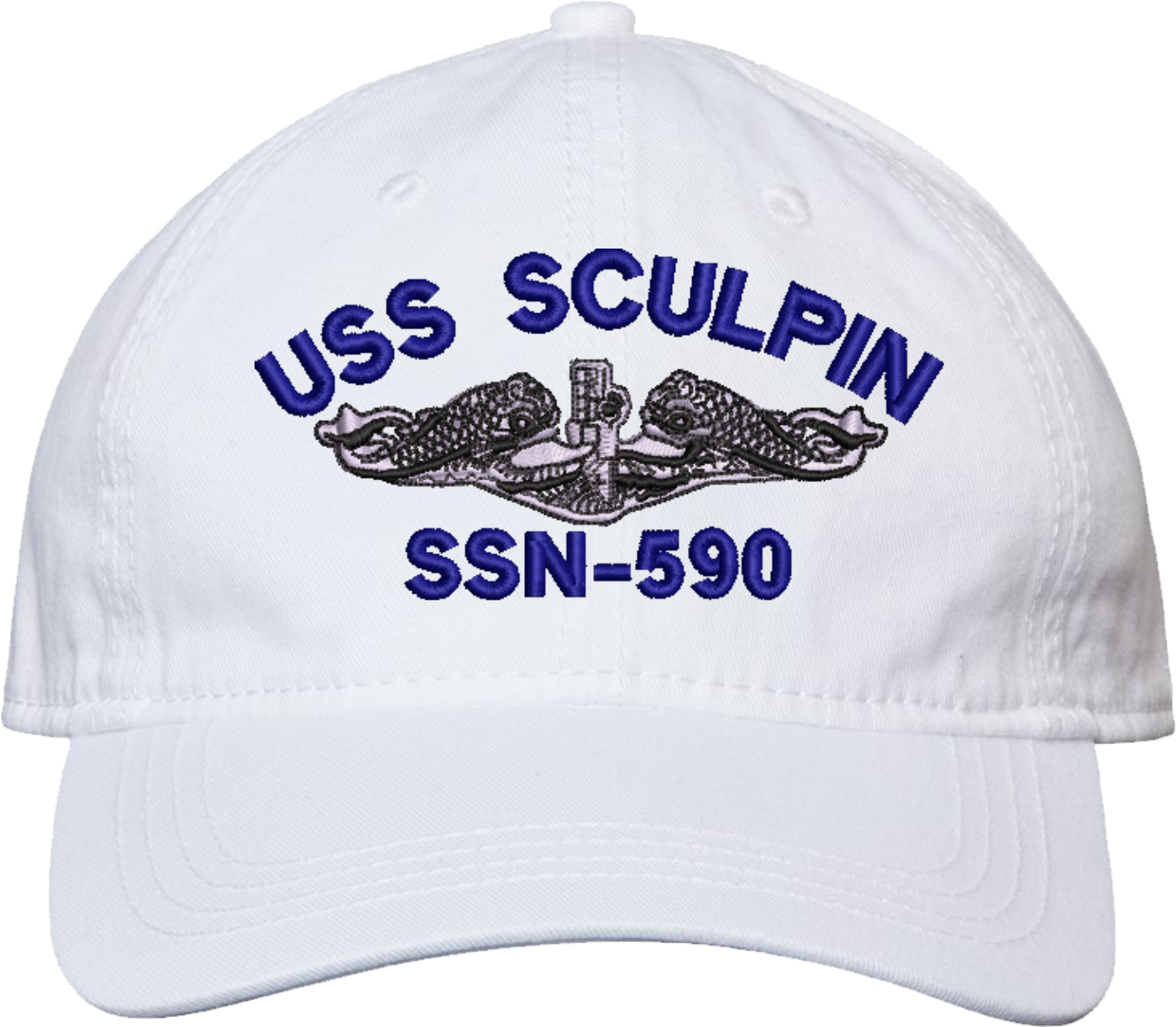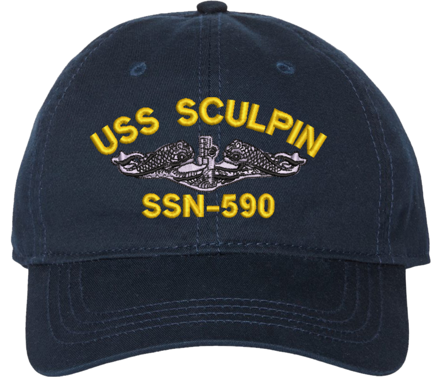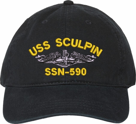 Show your Navy pride with this USS Sculpin SSN-590 with Dolphins Unstructured Dad Cap from MilitaryBest. Crafted from 100% washed chino twill cotton, this six-panel, low-profile cap offers a relaxed and comfortable fit. Featuring high-quality embroidery done in our Scottsboro, Alabama facility, this cap is designed with a pre-curved visor and an adjustable tri-glide buckle closure for a perfect fit. Whether for everyday wear or as a meaningful gift, this cap is a great way to honor your own or a loved one's service.For caps ordered with custom embroidered personalized text please allow an additional 3 to 5 days production time. All custom back text will be embroidered in ALL CAPITAL LETTERS. Caps with back text or eggs are non-returnable unless there is a material defect in the cap.