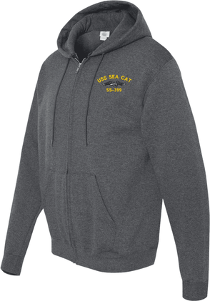 MilitaryBest has expanded its line of apparel with this custom embroidered USS Sea Fox SS-402 with Dolphins Embroidered Zippered Hoodie. Each Hoodie is direct embroidered onto a Champion brand 9.5 oz 50/50 Cotton Poly blend. This will make an excellent addition to your wardrobe, or a great gift. Your satisfaction is Guaranteed! These quality zippered hoodies are proudly embroidered at our facilities in Scottsboro, AL. Support the Army MWR program by purchasing only from Licensed Vendors.