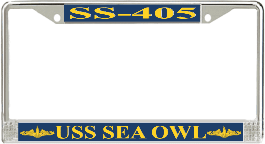 USS Sea Owl SS-405 License Plate Frame This USS Sea Owl SS-405 License Plate Frame is proudly made in the USA at our facilities in Scottsboro, Alabama. Each Frame features top and bottom sublimated design strips that are poly coated for a protective gloss finish. Please check your state and local regulations for compatibility of these frames for use on your vehicle.