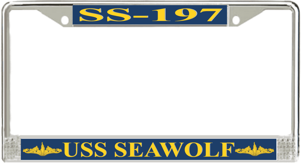 USS Seawolf SS-197 License Plate Frame This USS Seawolf SS-197 License Plate Frame is proudly made in the USA at our facilities in Scottsboro, Alabama. Each Frame features top and bottom sublimated design strips that are poly coated for a protective gloss finish. Please check your state and local regulations for compatibility of these frames for use on your vehicle.