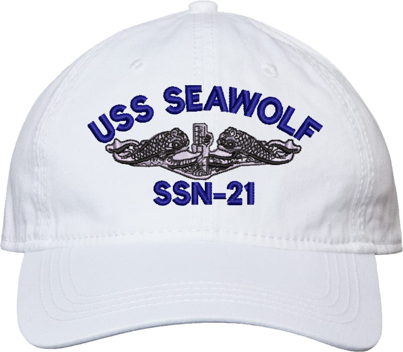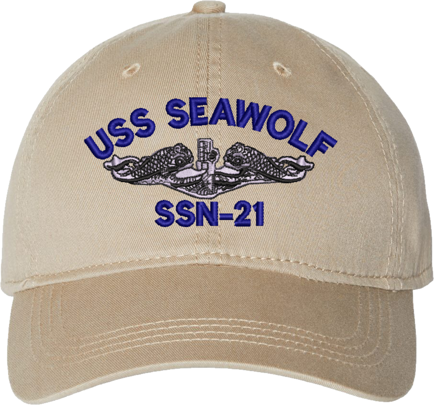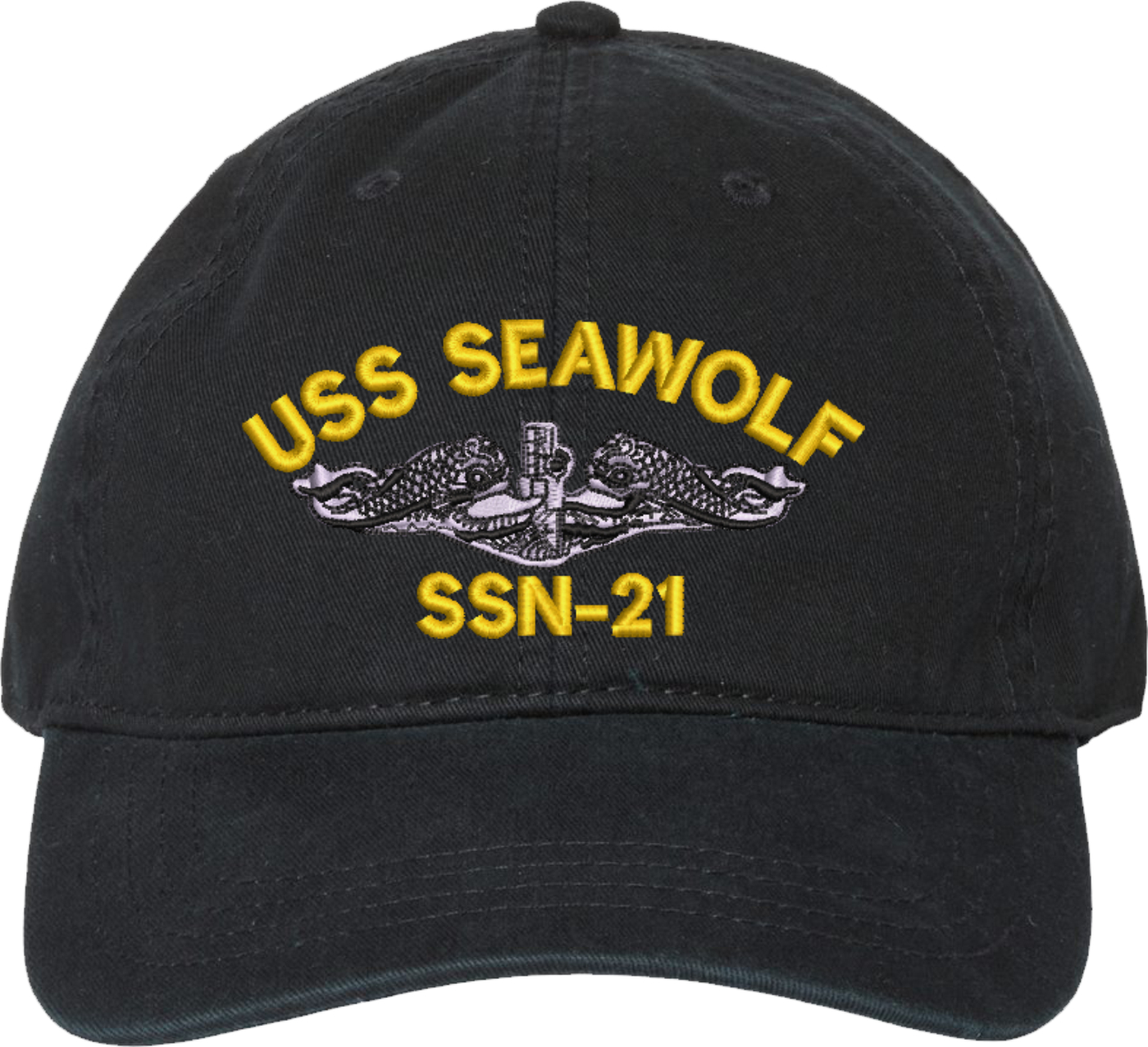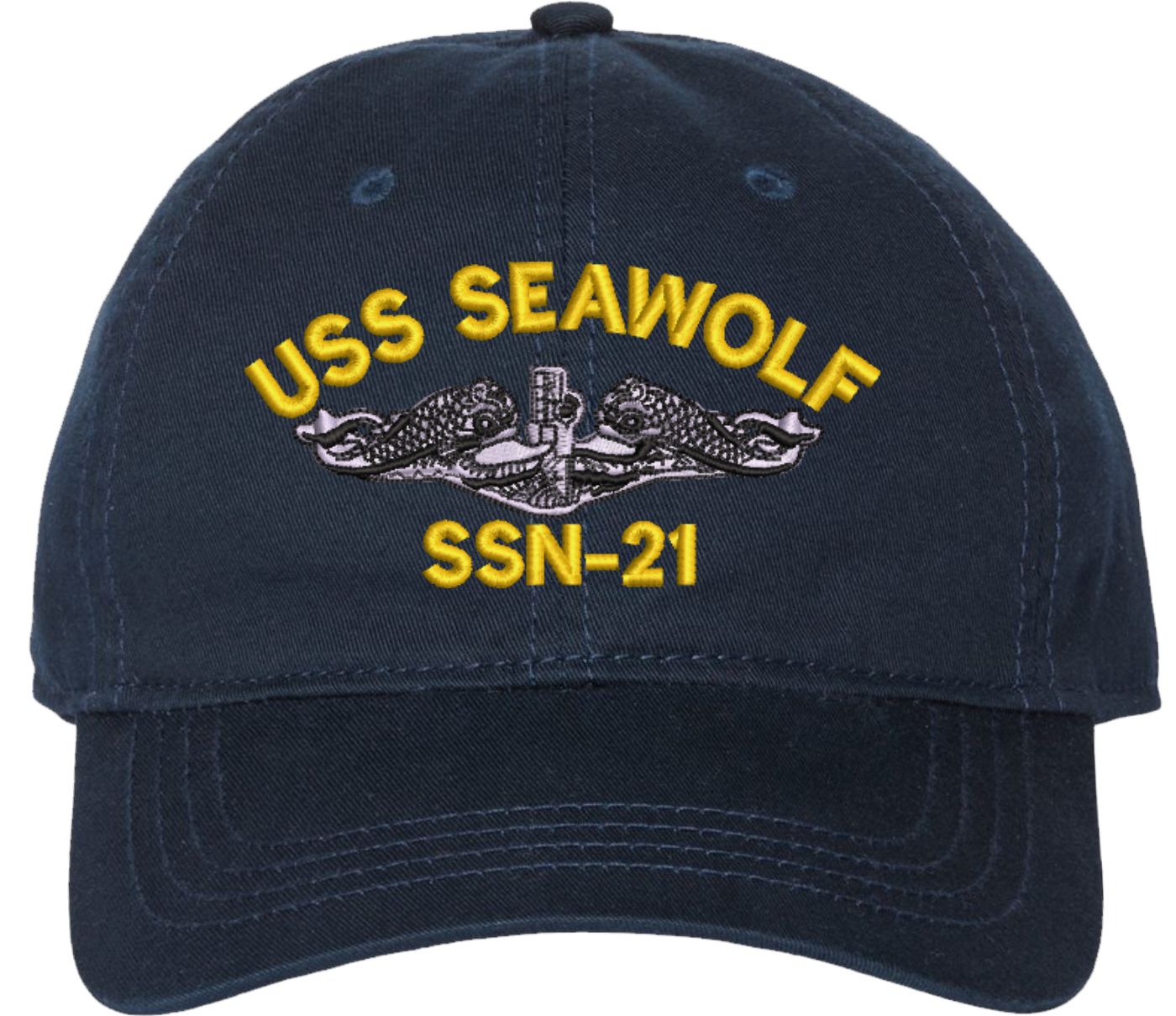 Show your Navy pride with this USS Seawolf SSN-21 with Dolphins Unstructured Dad Cap from MilitaryBest. Crafted from 100% washed chino twill cotton, this six-panel, low-profile cap offers a relaxed and comfortable fit. Featuring high-quality embroidery done in our Scottsboro, Alabama facility, this cap is designed with a pre-curved visor and an adjustable tri-glide buckle closure for a perfect fit. Whether for everyday wear or as a meaningful gift, this cap is a great way to honor your own or a loved one's service.For caps ordered with custom embroidered personalized text please allow an additional 3 to 5 days production time. All custom back text will be embroidered in ALL CAPITAL LETTERS. Caps with back text or eggs are non-returnable unless there is a material defect in the cap.