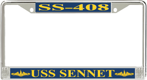 USS Sennet SS-408 License Plate Frame This USS Sennet SS-408 License Plate Frame is proudly made in the USA at our facilities in Scottsboro, Alabama. Each Frame features top and bottom sublimated design strips that are poly coated for a protective gloss finish. Please check your state and local regulations for compatibility of these frames for use on your vehicle.