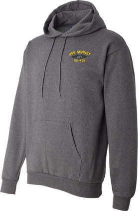 MilitaryBest has expanded its line of apparel with this custom embroidered USS Sennet SS-408 with Dolphins Embroidered Hoodie. Each Hoodie is direct embroidered onto a Champion brand 9.5 oz 50/50 Cotton Poly blend. This Hoodie will make an excellent addition to your wardrobe, or a great gift. Your satisfaction is Guaranteed! These quality hoodies are proudly embroidered at our facilities in Scottsboro, AL. Support the Army MWR program by purchasing only from Licensed Vendors.