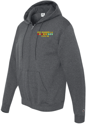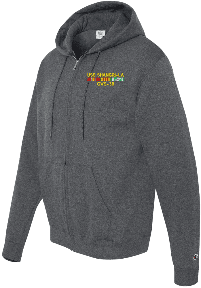 MilitaryBest has expanded its line of apparel with this custom embroidered USS Shangri-La CVS-38 with Vietnam Service Ribbons Zippered Hoodie. Each Hoodie is direct embroidered onto a Champion brand 9.5 oz 50/50 Cotton Poly blend. This will make an excellent addition to your wardrobe, or a great gift. Your satisfaction is Guaranteed! This is custom embroidered at our facilities in Scottsboro, AL.