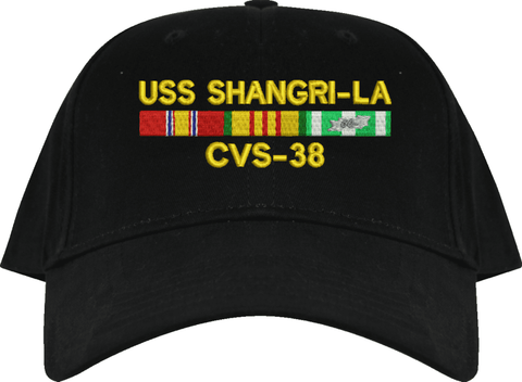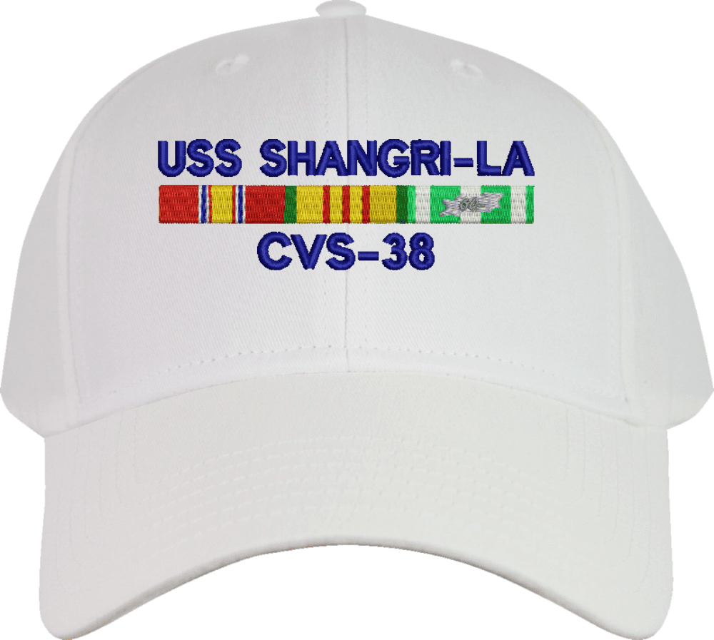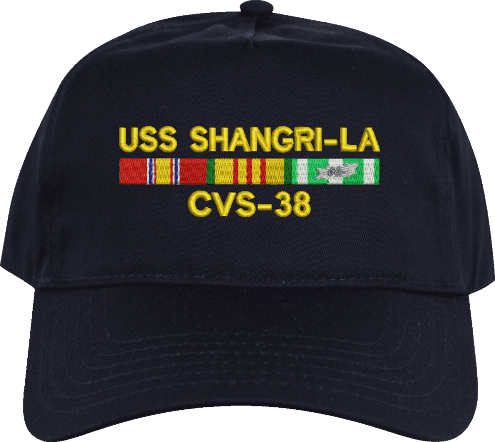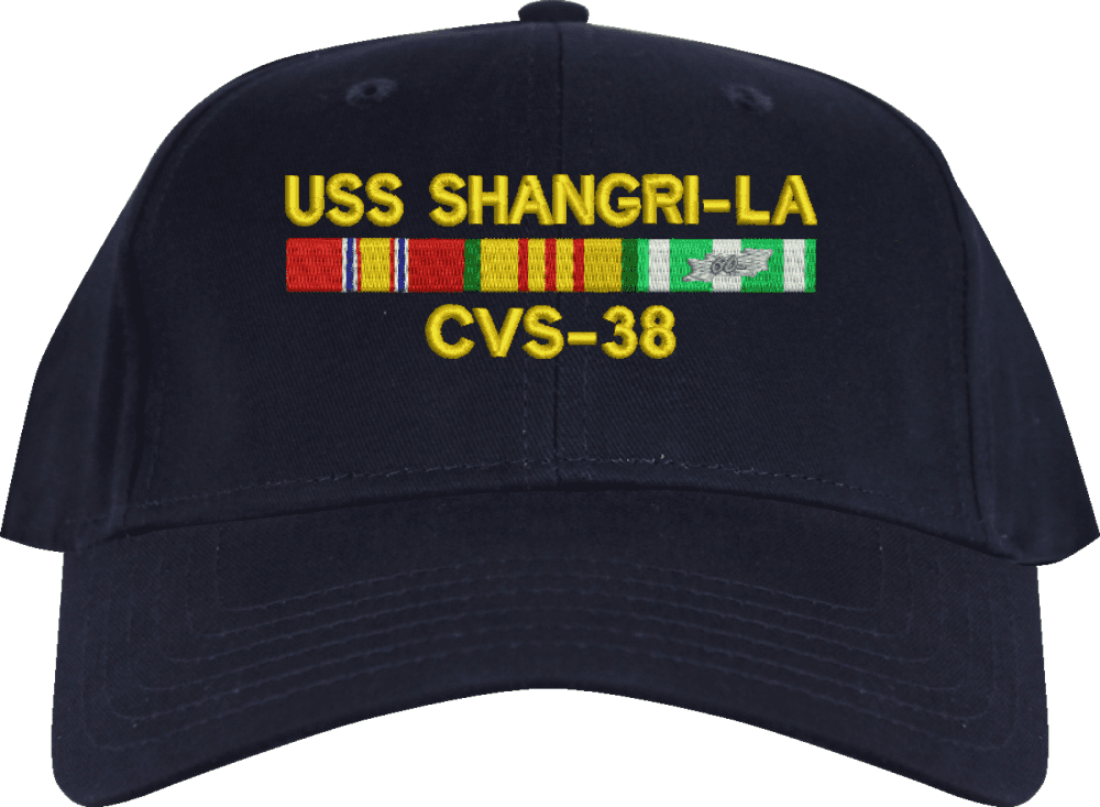 MilitaryBest is proud to offer this USS Shangri-La CVS-38 with Vietnam Service Ribbons Embroidered Cap. This cap is available in a 5 panel high profile or 6 panel low profile styling. All our caps are made from top quality materials. This cap would make a wonderful addition to your collection or a great gift! All custom embroidery is done at our facility in Scottsboro, AL. *Caps ordered with embroidered back text requires an additional 1 to 2 days of production time. All personalized caps will be embroidered in ALL CAPITAL LETTERS. Caps personalized with back text are not returnable unless there is a material defect in the cap.A percentage of the sale of each MilitaryBest item is forwarded to the licensing departments of each respective branch of service in support of the MWR (Morale, Welfare, & Recreation) program. These payments are made by either ALL4U LLC or the wholesaler from where the item originated. Our team thanks you for your service and your support of these programs.