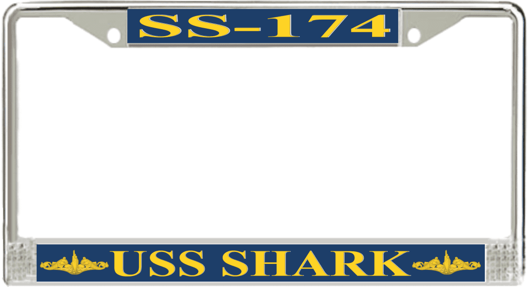 USS Shark SS-174 License Plate Frame This USS Shark SS-174 License Plate Frame is proudly made in the USA at our facilities in Scottsboro, Alabama. Each Frame features top and bottom sublimated design strips that are poly coated for a protective gloss finish. Please check your state and local regulations for compatibility of these frames for use on your vehicle.