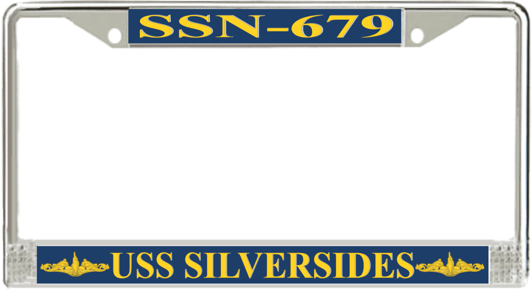 USS Silversides SSN-679 License Plate Frame This USS Silversides SSN-679 License Plate Frame is proudly made in the USA at our facilities in Scottsboro, Alabama. Each Frame features top and bottom sublimated design strips that are poly coated for a protective gloss finish. Please check your state and local regulations for compatibility of these frames for use on your vehicle.