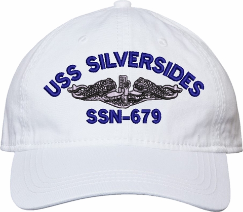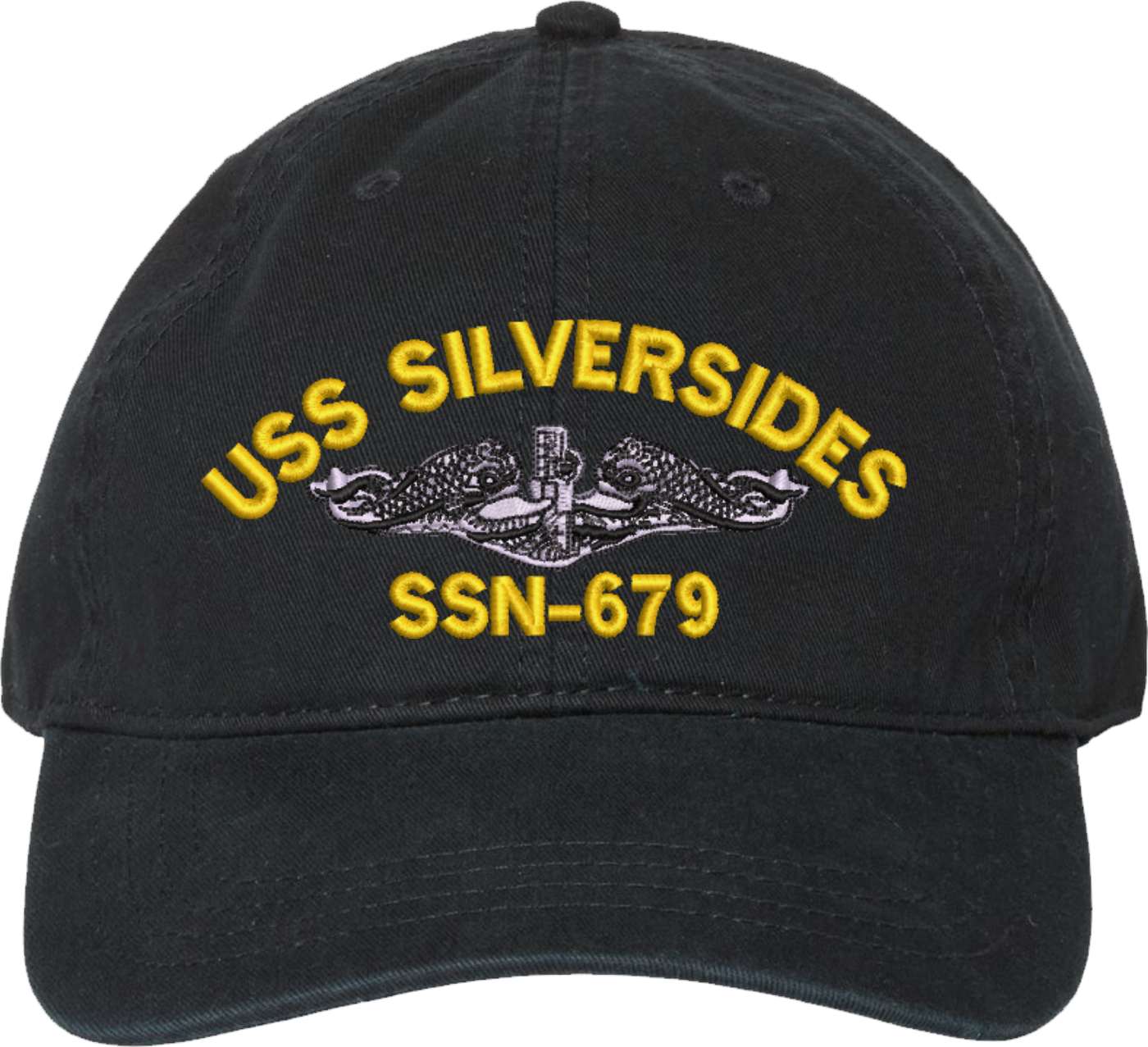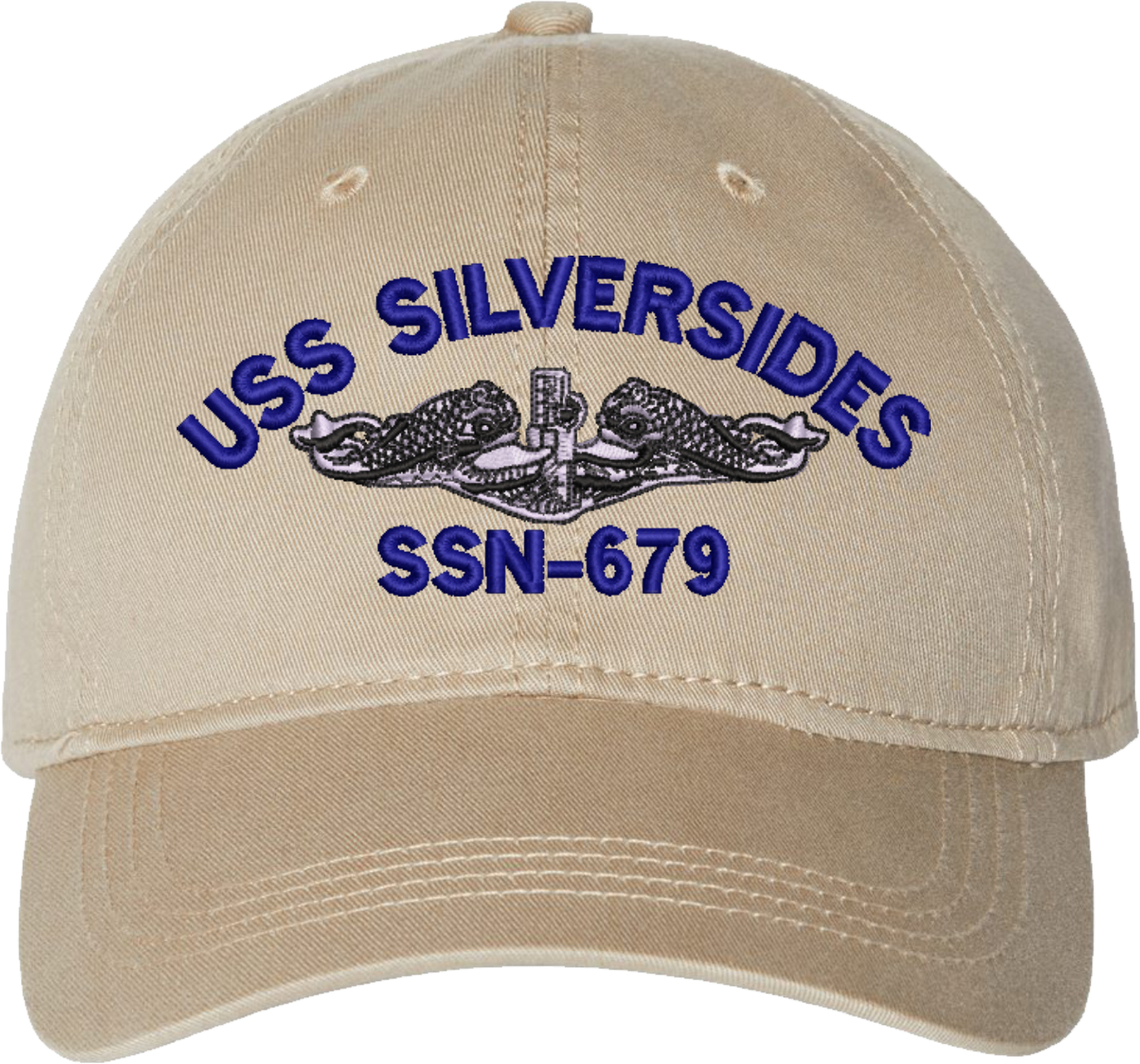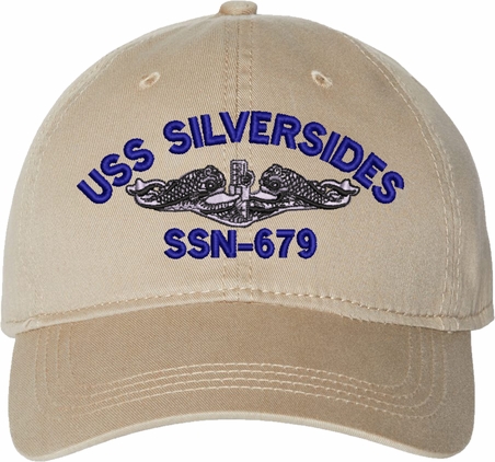 Show your Navy pride with this USS Silversides SSN-679 with Dolphins Unstructured Dad Cap from MilitaryBest. Crafted from 100% washed chino twill cotton, this six-panel, low-profile cap offers a relaxed and comfortable fit. Featuring high-quality embroidery done in our Scottsboro, Alabama facility, this cap is designed with a pre-curved visor and an adjustable tri-glide buckle closure for a perfect fit. Whether for everyday wear or as a meaningful gift, this cap is a great way to honor your own or a loved one's service.For caps ordered with custom embroidered personalized text please allow an additional 3 to 5 days production time. All custom back text will be embroidered in ALL CAPITAL LETTERS. Caps with back text or eggs are non-returnable unless there is a material defect in the cap.