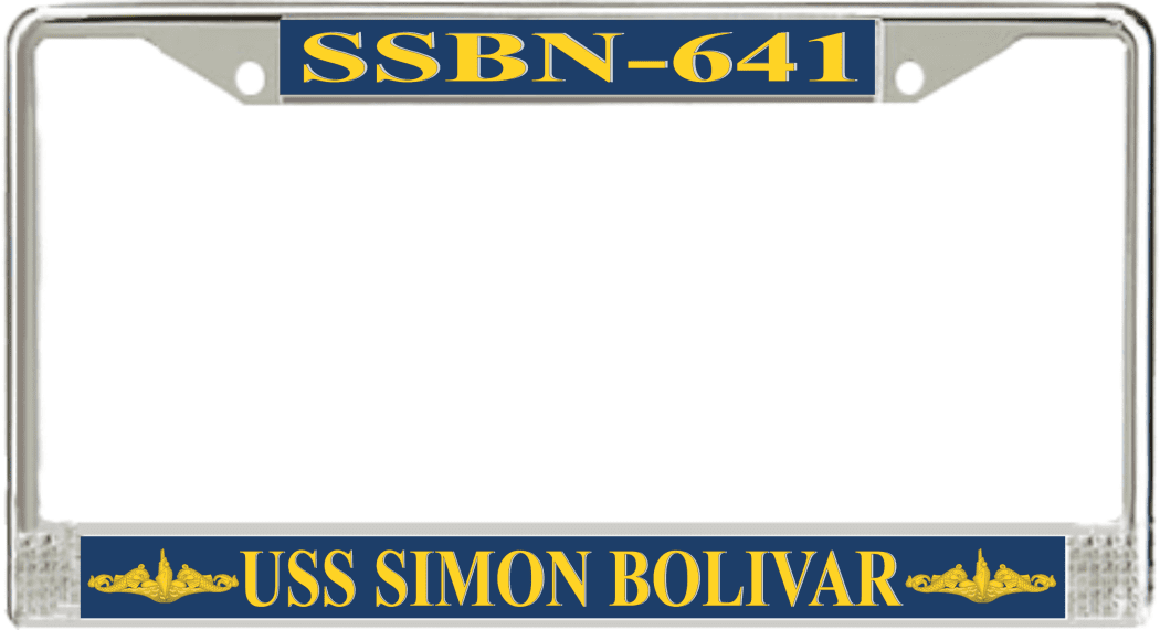 USS Simon Bolivar SSBN-641 License Plate Frame This USS Simon Bolivar SSBN-641 License Plate Frame is proudly made in the USA at our facilities in Scottsboro, Alabama. Each Frame features top and bottom sublimated design strips that are poly coated for a protective gloss finish. Please check your state and local regulations for compatibility of these frames for use on your vehicle.