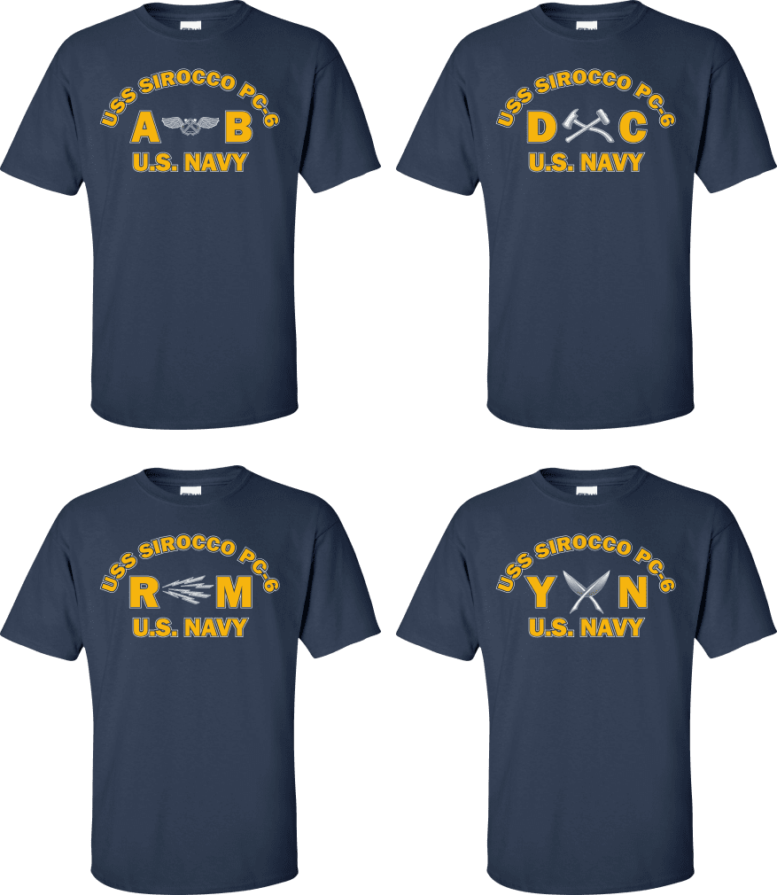Due to disruptions in supply chains, this design will be embroidered on a Champion, Gildan, Jerzees or comparable brand.Proudly display your ship and rate with our top quality USS SIROCCO PC-6 Rates t-shirts, sweatshirts, and hoodies. These fine U.S. Navy apparel items will make you the envy of your veteran buddies, or will make a fine gift! Our USS SIROCCO PC-6 shirts are proudly printed in the USA!