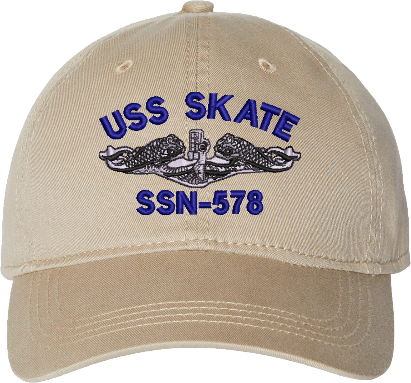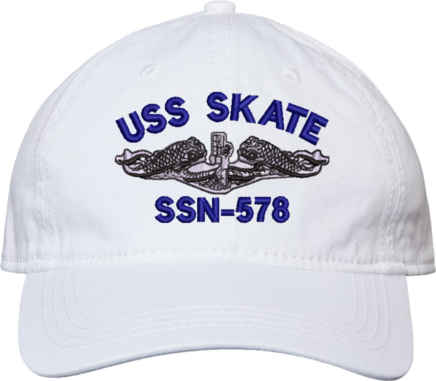 Show your Navy pride with this USS Skate SSN-578 with Dolphins Unstructured Dad Cap from MilitaryBest. Crafted from 100% washed chino twill cotton, this six-panel, low-profile cap offers a relaxed and comfortable fit. Featuring high-quality embroidery done in our Scottsboro, Alabama facility, this cap is designed with a pre-curved visor and an adjustable tri-glide buckle closure for a perfect fit. Whether for everyday wear or as a meaningful gift, this cap is a great way to honor your own or a loved one's service.For caps ordered with custom embroidered personalized text please allow an additional 3 to 5 days production time. All custom back text will be embroidered in ALL CAPITAL LETTERS. Caps with back text or eggs are non-returnable unless there is a material defect in the cap.