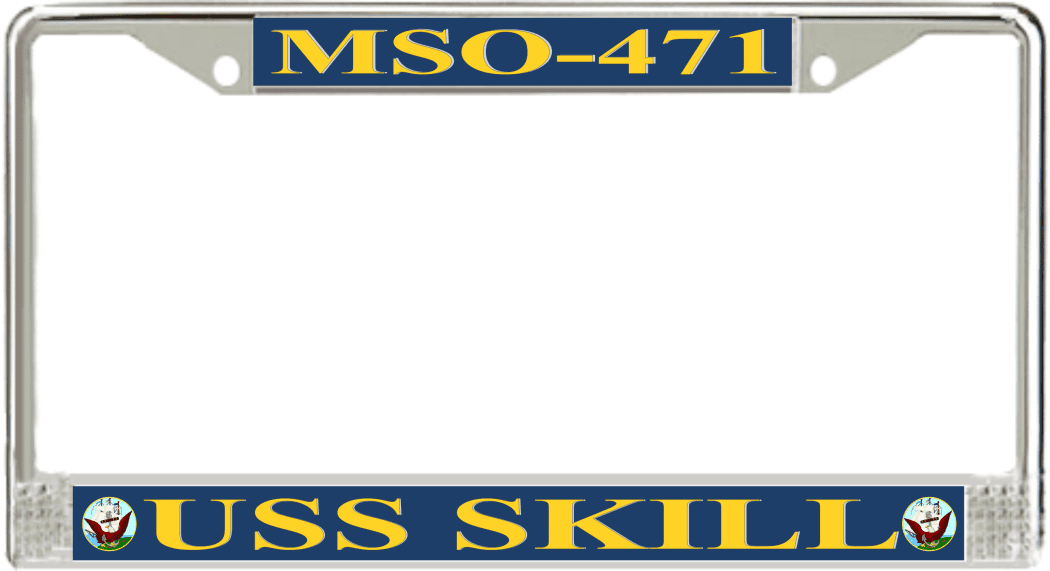 USS Skill MSO-471 License Plate FrameThis USS Skill MSO-471 License Plate Frame is proudly made in the USA at our facilities in Scottsboro, Alabama. Each of our MilitaryBest U.S. Navy Frames feature top and bottom Poly Coated Aluminum strips that are printed using sublimation which gives these quality automobile military frames a beautiful high gloss finish.