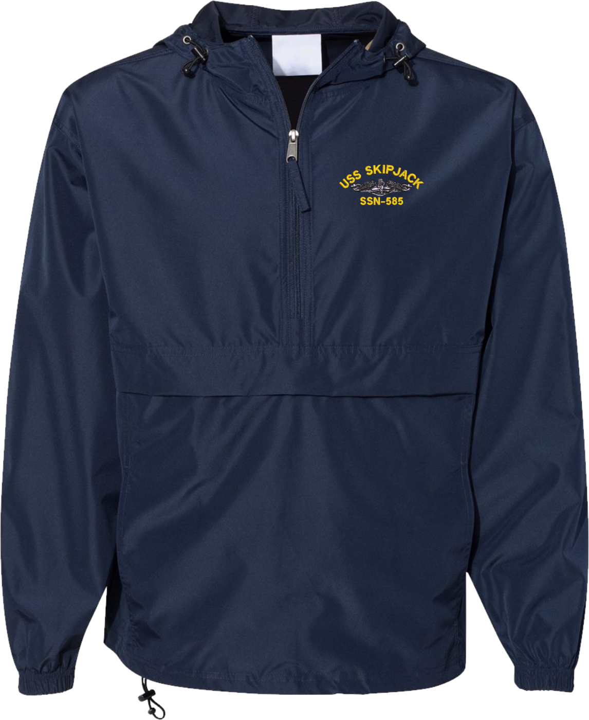 MilitaryBest is proud to offer this quality USS Skipjack SSN-585 with Dolphins Hooded Windbreaker. Also known as an Anorak Jacket, this windbreaker is designed to keep wind and water out. With a design embroidered over the left chest, this windbreaker is embroidered to order at our facilities in Scottsboro, AL.. This windbreaker can be packed into the mesh lined pouch pocket for a more portable method of storage.- 100% Polyester