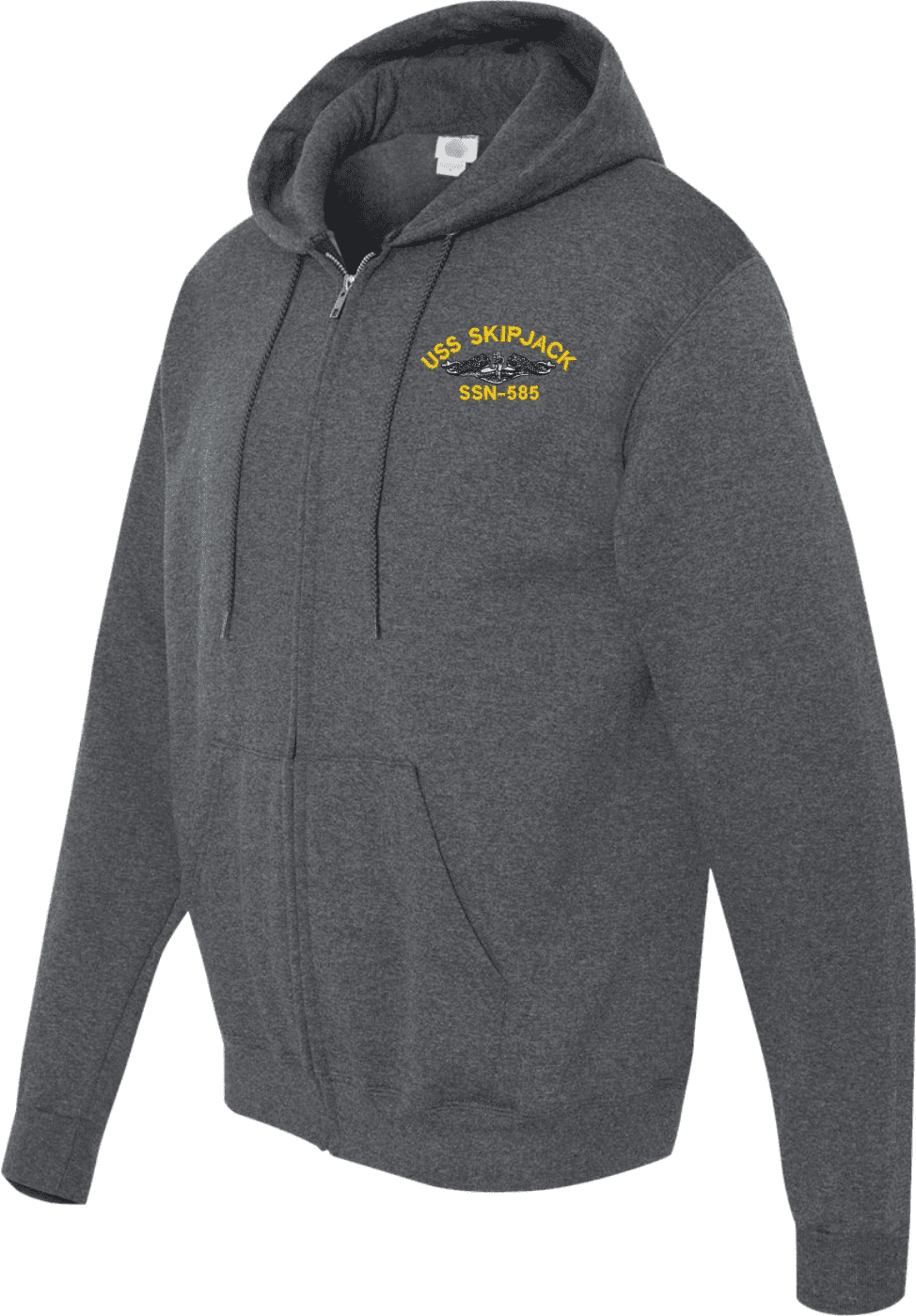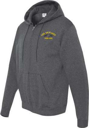 MilitaryBest has expanded its line of apparel with this custom embroidered USS Skipjack SSN-585 with Dolphins Embroidered Zippered Hoodie. Each Hoodie is direct embroidered onto a Champion brand 9.5 oz 50/50 Cotton Poly blend. This will make an excellent addition to your wardrobe, or a great gift. Your satisfaction is Guaranteed! These quality zippered hoodies are proudly embroidered at our facilities in Scottsboro, AL. Support the Army MWR program by purchasing only from Licensed Vendors.