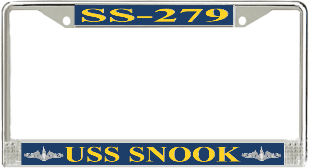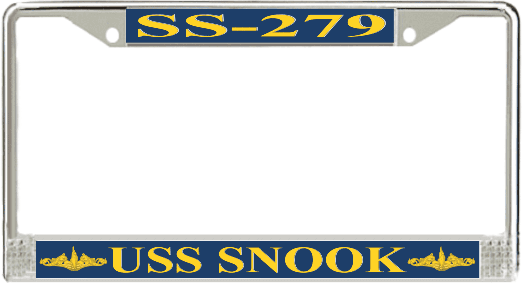 USS Snook SS-279 License Plate Frame This USS Snook SS-279 License Plate Frame is proudly made in the USA at our facilities in Scottsboro, Alabama. Each Frame features top and bottom sublimated design strips that are poly coated for a protective gloss finish. Please check your state and local regulations for compatibility of these frames for use on your vehicle.
