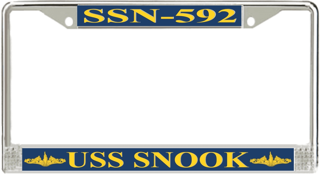 USS Snook SSN-592 License Plate Frame This USS Snook SSN-592 License Plate Frame is proudly made in the USA at our facilities in Scottsboro, Alabama. Each Frame features top and bottom sublimated design strips that are poly coated for a protective gloss finish. Please check your state and local regulations for compatibility of these frames for use on your vehicle.