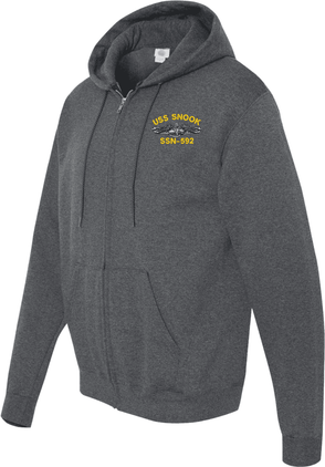 MilitaryBest has expanded its line of apparel with this custom embroidered USS Snook SSN-592 with Dolphins Embroidered Zippered Hoodie. Each Hoodie is direct embroidered onto a Champion brand 9.5 oz 50/50 Cotton Poly blend. This will make an excellent addition to your wardrobe, or a great gift. Your satisfaction is Guaranteed! These quality zippered hoodies are proudly embroidered at our facilities in Scottsboro, AL. Support the Army MWR program by purchasing only from Licensed Vendors.