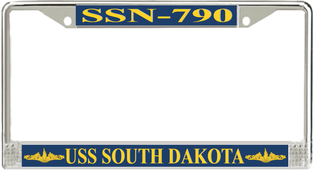 USS South Dakota SSN-790 License Plate Frame This USS South Dakota SSN-790 License Plate Frame is proudly made in the USA at our facilities in Scottsboro, Alabama. Each Frame features top and bottom sublimated design strips that are poly coated for a protective gloss finish. Please check your state and local regulations for compatibility of these frames for use on your vehicle.
