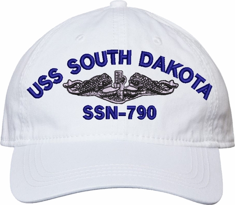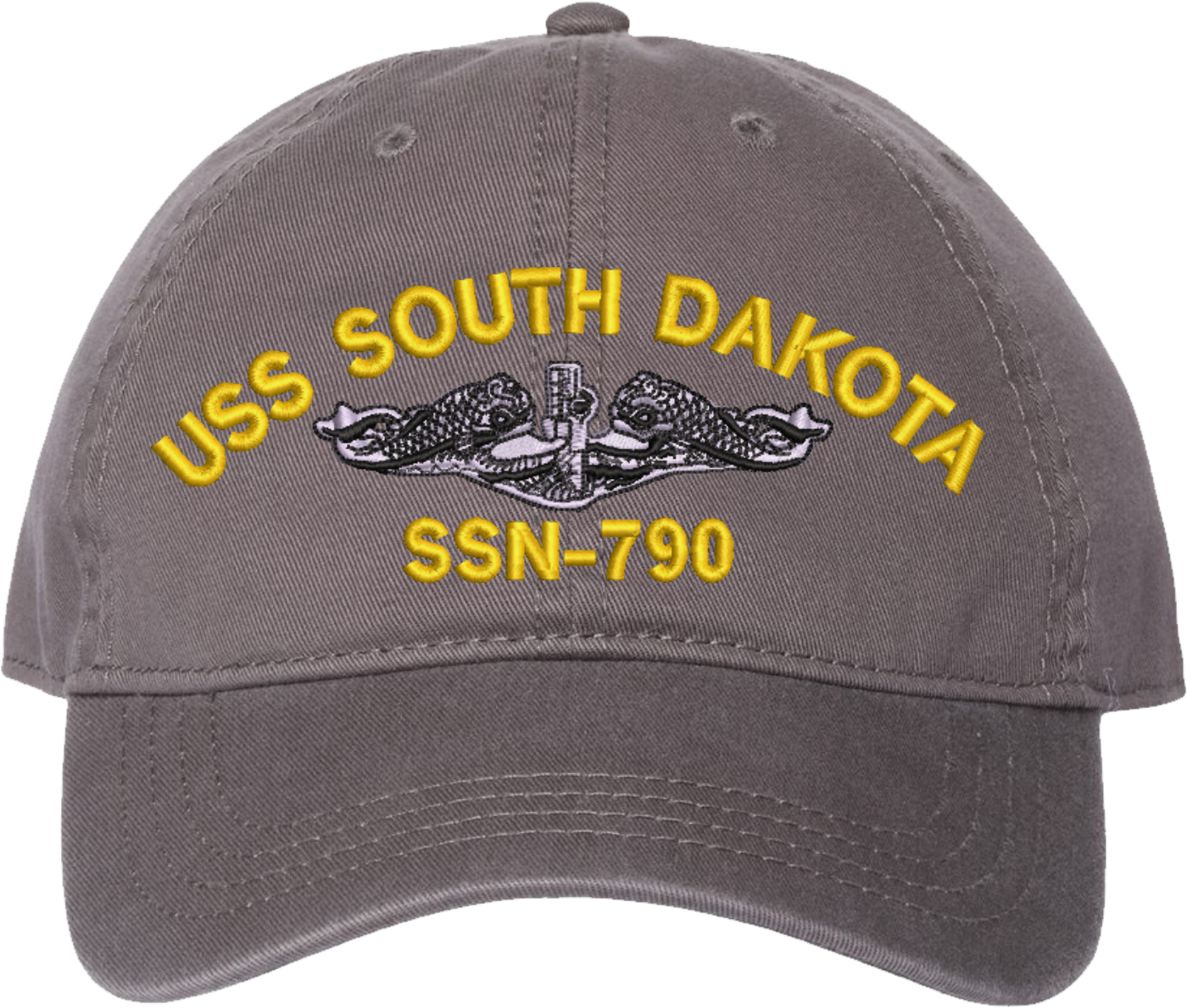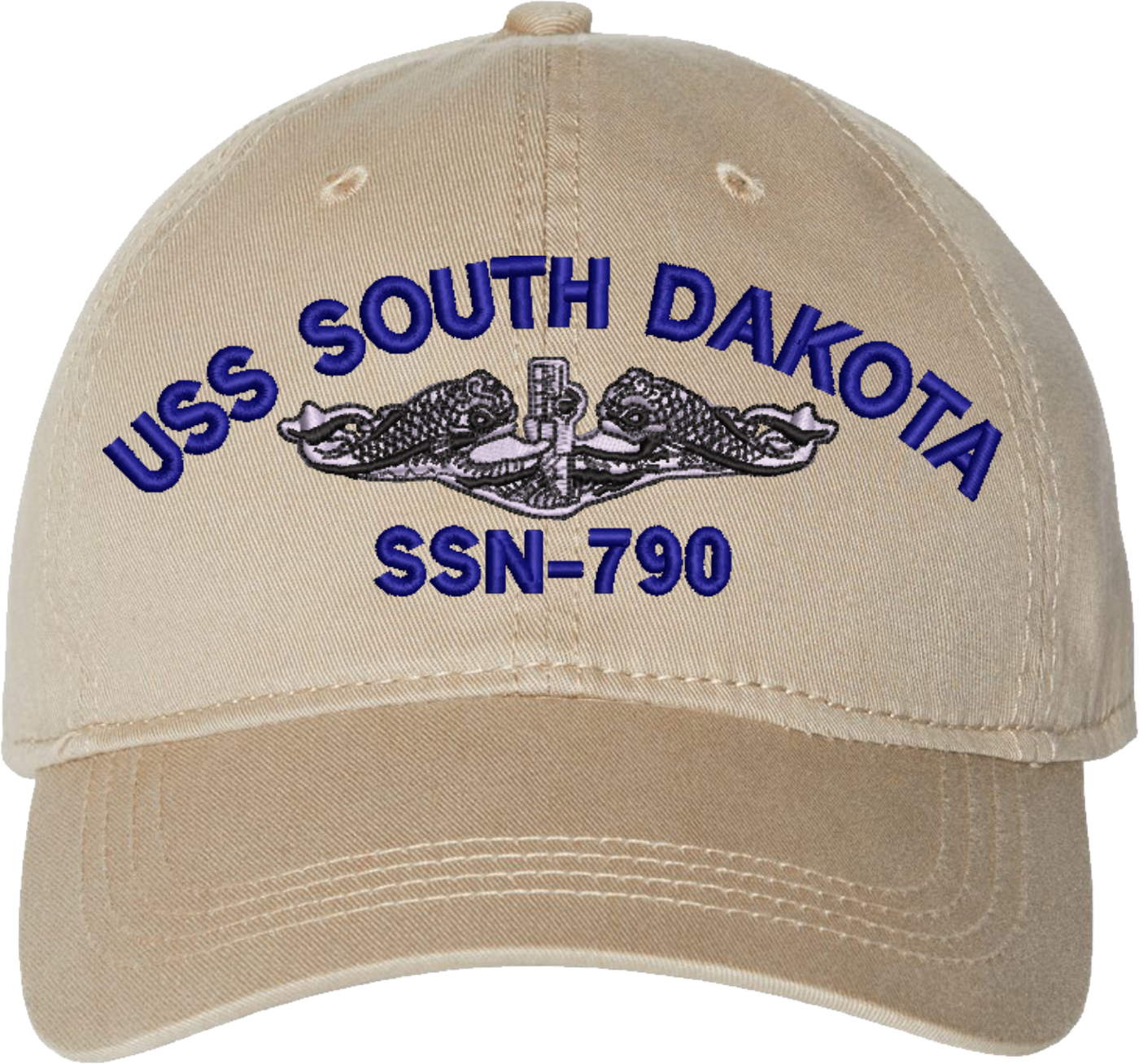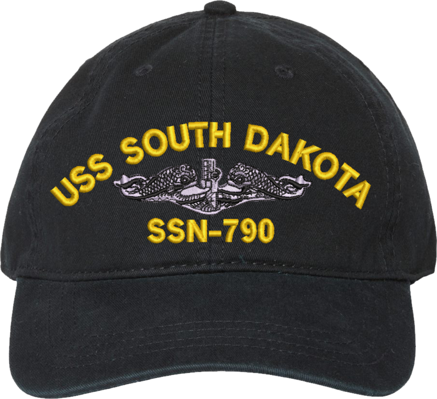 Show your Navy pride with this USS South Dakota SSN-790 with Dolphins Unstructured Dad Cap from MilitaryBest. Crafted from 100% washed chino twill cotton, this six-panel, low-profile cap offers a relaxed and comfortable fit. Featuring high-quality embroidery done in our Scottsboro, Alabama facility, this cap is designed with a pre-curved visor and an adjustable tri-glide buckle closure for a perfect fit. Whether for everyday wear or as a meaningful gift, this cap is a great way to honor your own or a loved one's service.For caps ordered with custom embroidered personalized text please allow an additional 3 to 5 days production time. All custom back text will be embroidered in ALL CAPITAL LETTERS. Caps with back text or eggs are non-returnable unless there is a material defect in the cap.