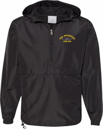 MilitaryBest is proud to offer this quality USS Spadefish SSN-668 with Dolphins Hooded Windbreaker. Also known as an Anorak Jacket, this windbreaker is designed to keep wind and water out. With a design embroidered over the left chest, this windbreaker is embroidered to order at our facilities in Scottsboro, AL.. This windbreaker can be packed into the mesh lined pouch pocket for a more portable method of storage.- 100% Polyester