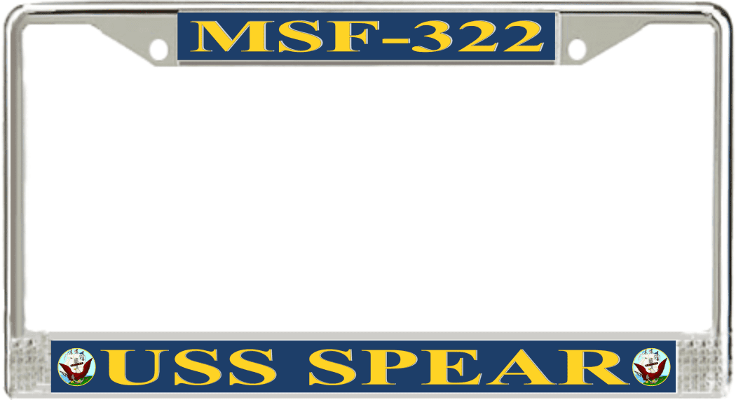 USS Spear MSF-322 License Plate FrameThis USS Spear MSF-322 License Plate Frame is proudly made in the USA at our facilities in Scottsboro, Alabama. Each of our MilitaryBest U.S. Navy Frames feature top and bottom Poly Coated Aluminum strips that are printed using sublimation which gives these quality automobile military frames a beautiful high gloss finish.