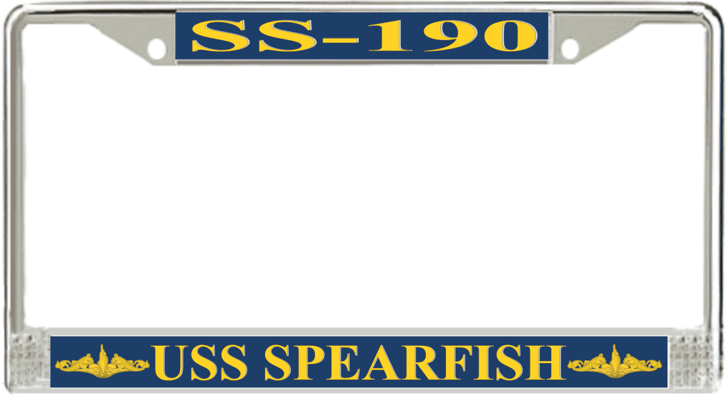 USS Spearfish SS-190 License Plate Frame This USS Spearfish SS-190 License Plate Frame is proudly made in the USA at our facilities in Scottsboro, Alabama. Each Frame features top and bottom sublimated design strips that are poly coated for a protective gloss finish. Please check your state and local regulations for compatibility of these frames for use on your vehicle.