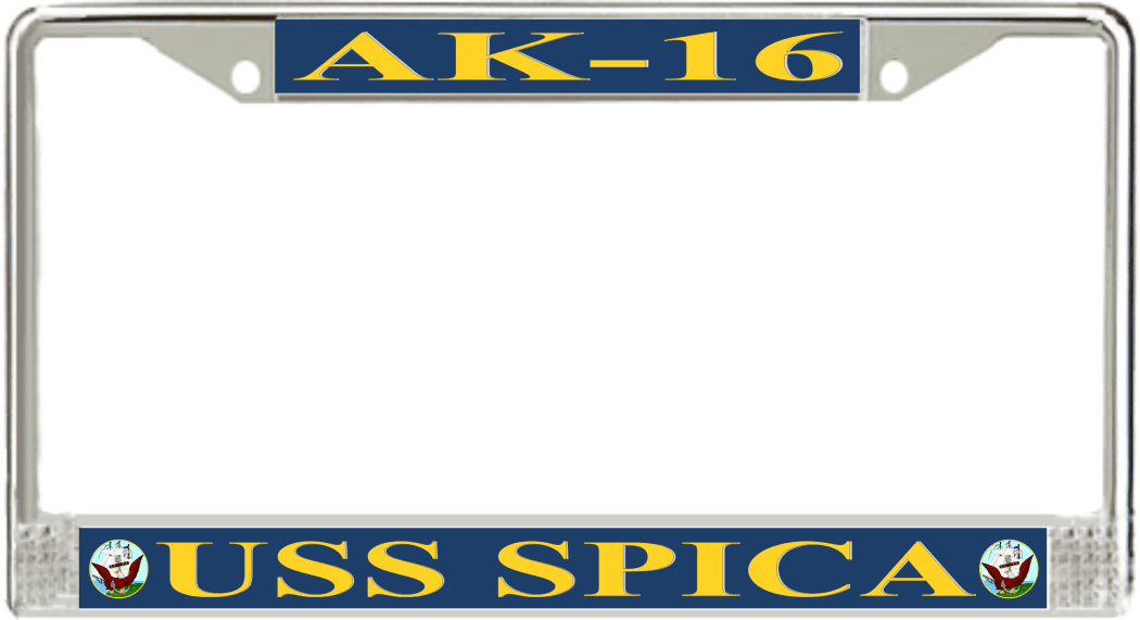 USS Spica AK-16 License Plate FrameThis USS Spica AK-16 License Plate Frame is proudly made in the USA at our facilities in Scottsboro, Alabama. Each of our MilitaryBest U.S. Navy Frames feature top and bottom Poly Coated Aluminum strips that are printed using sublimation which gives these quality automobile military frames a beautiful high gloss finish.