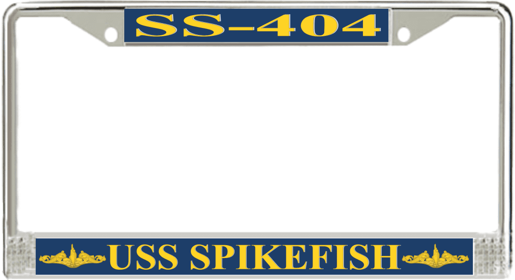 USS Spikefish SS-404 License Plate Frame This USS Spikefish SS-404 License Plate Frame is proudly made in the USA at our facilities in Scottsboro, Alabama. Each Frame features top and bottom sublimated design strips that are poly coated for a protective gloss finish. Please check your state and local regulations for compatibility of these frames for use on your vehicle.