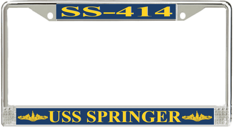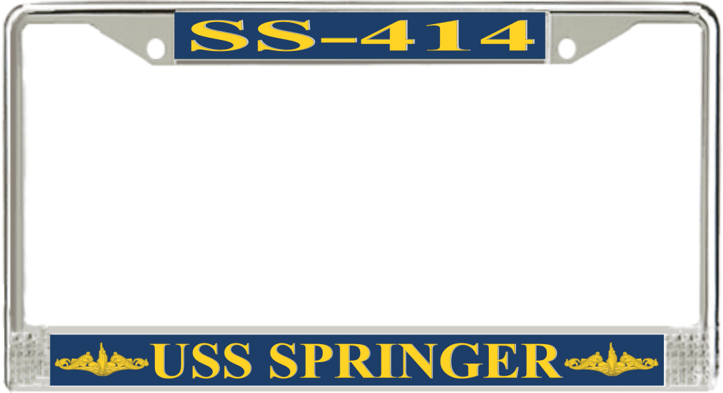 USS Springer SS-414 License Plate Frame This USS Springer SS-414 License Plate Frame is proudly made in the USA at our facilities in Scottsboro, Alabama. Each Frame features top and bottom sublimated design strips that are poly coated for a protective gloss finish. Please check your state and local regulations for compatibility of these frames for use on your vehicle.