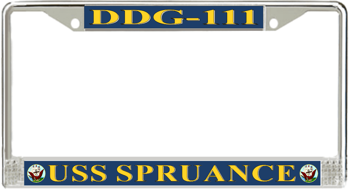 USS Spruance DDG-111 License Plate FrameThis USS Spruance DDG-111 License Plate Frame is proudly made in the USA at our facilities in Scottsboro, Alabama. Each of our MilitaryBest U.S. Navy Frames feature top and bottom Poly Coated Aluminum strips that are printed using sublimation which gives these quality automobile military frames a beautiful high gloss finish.