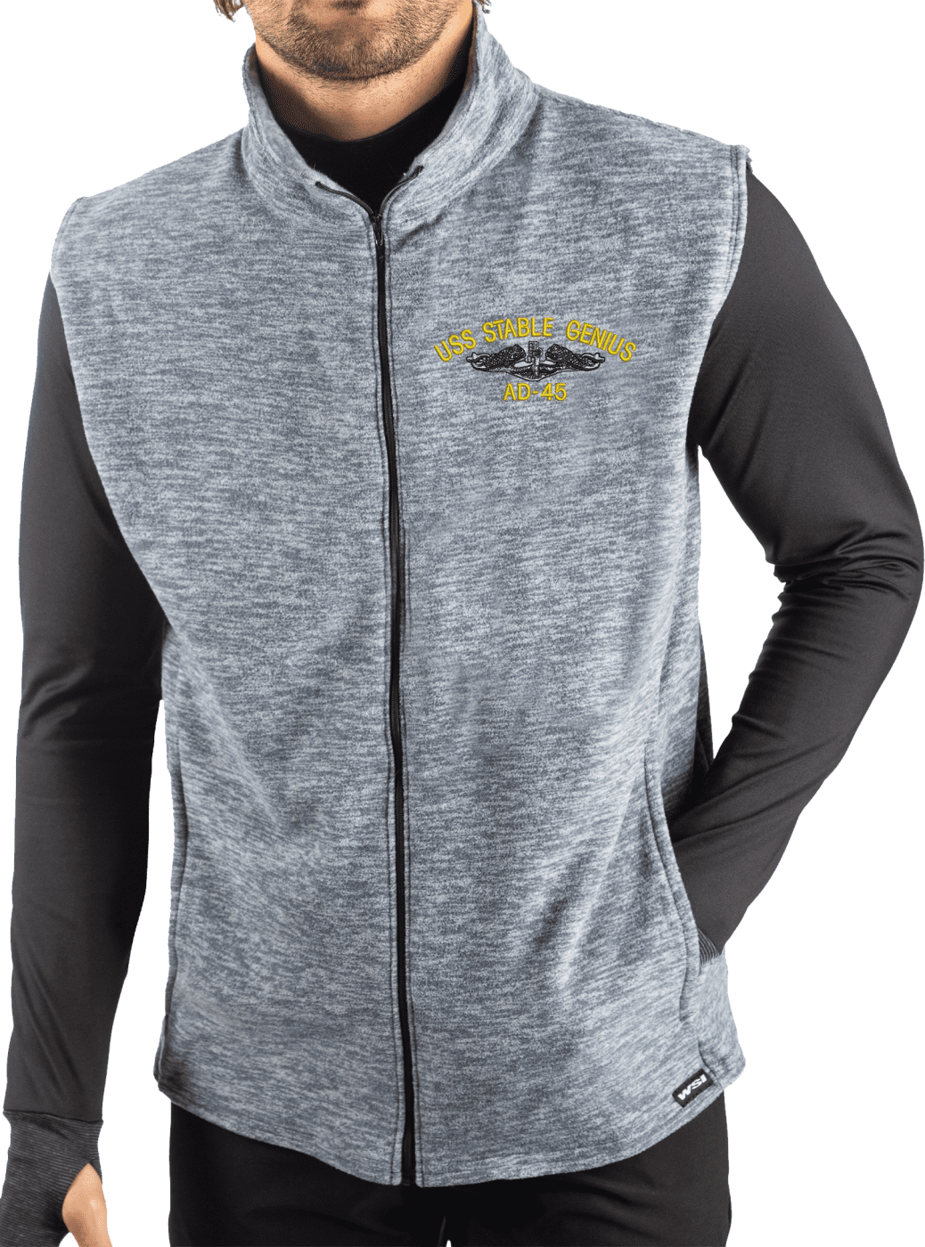 MilitaryBest is proud to offer this USS Stable Genius AD-45 with Dolphins Embroidered Polar Fleece Vest. This quality vest is Manufactured by WSI Sportswear in Minnesota and Embroidered by our MilitaryBest team in Northeast Alabama. We remain fully committed to growing our line of 100% Made in the USA products. Each U.S. Air Force Retired Vest is offered in Heather Gray and Heather Blue.PRODUCT FEATURES